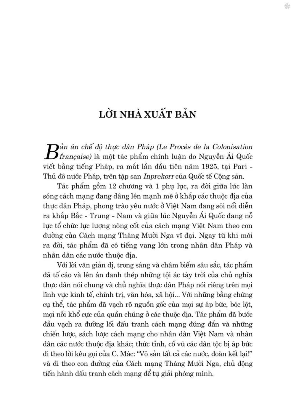 Bản án chế độ thực dân Pháp là một tác phẩm chính luận sâu sắc của Nguyễn Ái Quốc, viết bằng tiếng Pháp và ra mắt lần đầu vào năm 1925 tại Paris, trong bối cảnh cuộc đấu tranh chống lại chế độ thực dân Pháp đang diễn ra mạnh mẽ ở các thuộc địa. Tác phẩm này không chỉ phản ánh sự tàn bạo của chủ nghĩa thực dân mà còn khẳng định quyền tự do, độc lập của các dân tộc thuộc địa. Với 12 chương và 1 phụ lục, ra đời giữa lúc làn sóng cách mạng đang dâng lên mạnh mẽ ở khắp các thuộc địa của thực dân Pháp, phong trào yêu nước của Việt Nam đang sôi nổi diễn ra khắp Bắc - Trung - Nam và giữa lúc Nguyễn Ái Quốc đang nỗ lực giáo dục, tổ chức lực lượng nòng cốt của cách mạng Việt Nam theo con đường của Cách mạng Tháng Mười Nga vĩ đại. Đồng thời kêu gọi sự đoàn kết giữa các quốc gia bị áp bức trong cuộc đấu tranh giành lại độc lập.