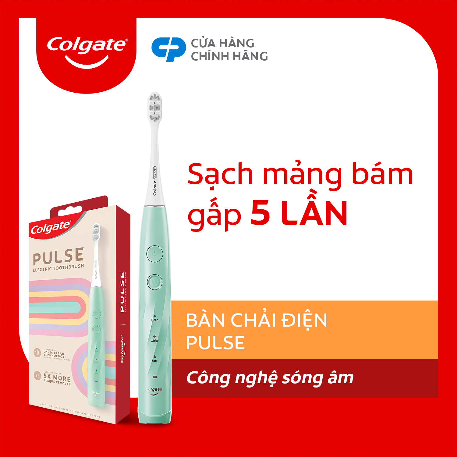 Giới thiệu Bàn chải điện Colgate PULSE công nghệ sóng âm, sạch mảng bám gấp 5 lần, pin 60 ngày Nâng tầm trải nghiệm chải răng sạch mảng bám gấp 5 lần với Bàn chải điện Colgate PULSE. Công nghệ sóng âm giúp việc chải răng nhẹ nhàng, giản đơn hơn bao giờ hết! Công nghệ sóng âm lên tới 37,000 nhịp rung/ phút làm sạch sâu kẽ răng và đường viền nướu. Sạch mảng bám gấp 5 lần so với bàn chải Colgate lông phẳng thông thường. 3 chế độ làm sạch linh hoạt, đáp ứng mọi nhu cầu: Sạch sâu, Trắng răng, Êm dịu Thời lượng pin lên đến 60 ngày^ sử dụng trong 1 lần sạc. Cảm biến hướng dẫn chải răng thông minh: Tự động dừng sau chu trình 2 phút, và thông báo chuyển vùng chải răng mỗi 30 giây. Đầu bàn chải có tích hợp mặt chải lưỡi, làm sạch vi khuẩn gây mùi. Bộ sản phẩm Bàn chải điện Colgate PULSE mới gồm 2 loại đầu thay (chăm sóc nướu và sạch sâu), 1 giá đỡ bàn chải, 1 dây sạch USB. *so với bàn chải Colgate lông phẳng thông thường Dữ liệu từ Colgate Lab và thử nghiệm được tiến hành ở Chế độ Êm dịu.   Hướng dẫn sử dụng bàn chải điện Colgate PULSE: