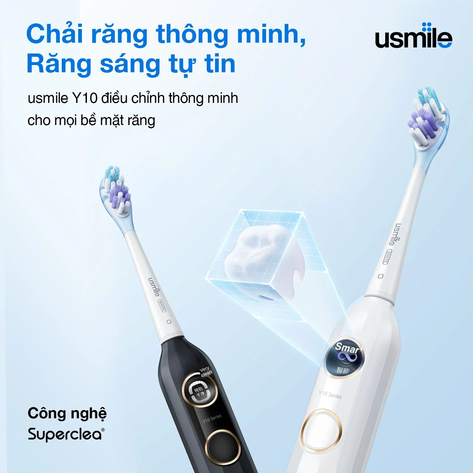 Thêm một điểm cộng cho sản phẩm là được trang bị vùng lông bàn chải màu xanh với công dụng nhắc nhở người dùng khi cần thay mới. Hầu hết chúng ta vì quá bận nên thường quên đổi đầu bàn chải mới sau mỗi ba tháng, điều này hoàn toàn không tốt cho sức khỏe răng miệng. Với usmile Y10, phần lông bàn chải màu xanh sẽ nhạt dần sau 3 tháng. Đó là lời nhắc nhở bạn nên thay bàn chải mới để đảm bảo khả năng làm sạch của sản phẩm và bảo vệ sức khỏe răng miệng.Thời lượng pin dài đã trở thành tính năng thương hiệu để nhiều người dùng nhớ đến usmile. Lần này, Y10 cũng được trang bị viên pin lithium-ion 2500mAh, mỗi lần sạc cho khả năng hoạt động từ 180 ngày trở lên (2 lần mỗi ngày, mỗi lần 2 phút). Sản phẩm tích hợp cổng sạc type-C tiện dụng, dễ sạc dù ở bất cứ đâu.