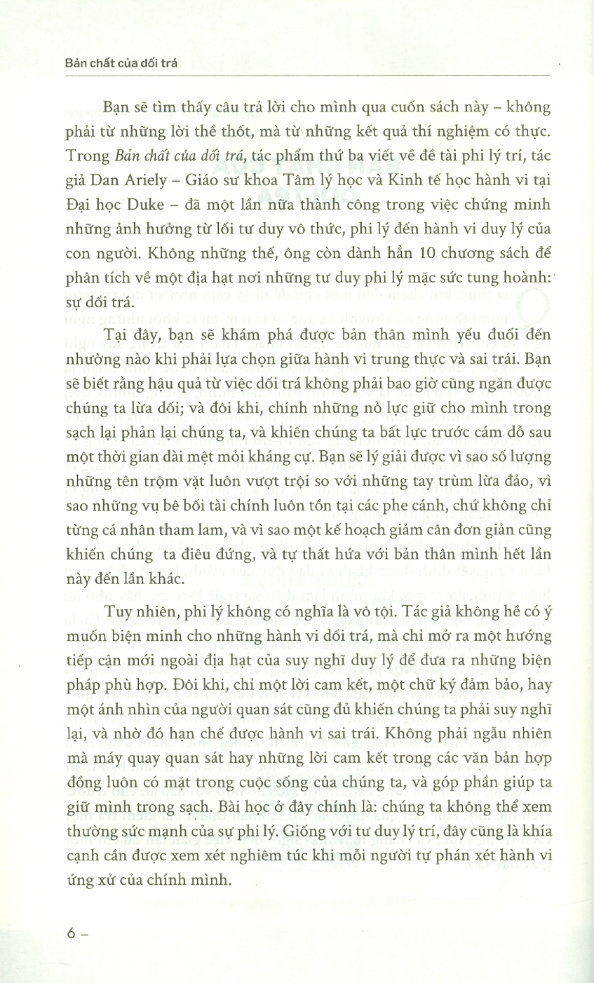 Hầu hết chúng ta đều nghĩ mình trung thực, nhưng, trên thực tế, tất cả chúng ta đều dối trá. Từ Washington đến Phố Wall, từ lớp học đến nơi làm việc, hành vi phi đạo đức xuất hiện ở khắp mọi nơi. Không ai trong chúng là ngoại lệ, cho dù đó là một lời nói không gây hại (white lie) đến các báo cáo tài chính gian lận. Trong cuốn sách Bản chất của dối trá, cuốn sách từng đoạt giải thưởng lớn - tác giả sách bán chạy nhất, Dan Ariely cho thấy tại sao một số điều dễ nói dối hơn những điều khác, làm thế nào để gặp ít vấn đề hơn chúng ta tưởng hơn khi bị lừa dối, và cách hoạt động kinh doanh đã mở đường cho các hành vi phi đạo đức, cả cố ý lẫn vô ý như thế nào. Ariely đã khám phá ra cách thức hoạt động của các hành vi phi đạo đức trong cuộc sống riêng, công việc và chính trị, và nó đã ảnh hưởng đến tất cả chúng ta như thế nào, ngay cả khi chúng ta nghĩ mình có những tiêu chuẩn đạo đức cao. Ariely cũng xác định những gì giúp chúng ta trung thực, chỉ đường cho việc trở thành người có đạo đức hơn trong cuộc sống hàng ngày của chúng ta. Với những phát hiện từ chính tác giả lẫn những phát hiện học thuật, cuốn sách sẽ thay đổi cách chúng ta nhìn nhận chính mình, hành động của bản thân và những người khác.