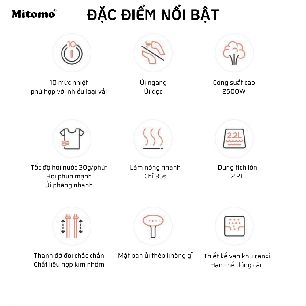 Bàn ủi hơi nước đứng Mitomo GC-559 công suất 2200W bảo hành 3 năm toàn quốc. - Qúy khách cần tư vấn thêm về sản phẩm vui lòng gọi 1900633475 - Shop có hỗ