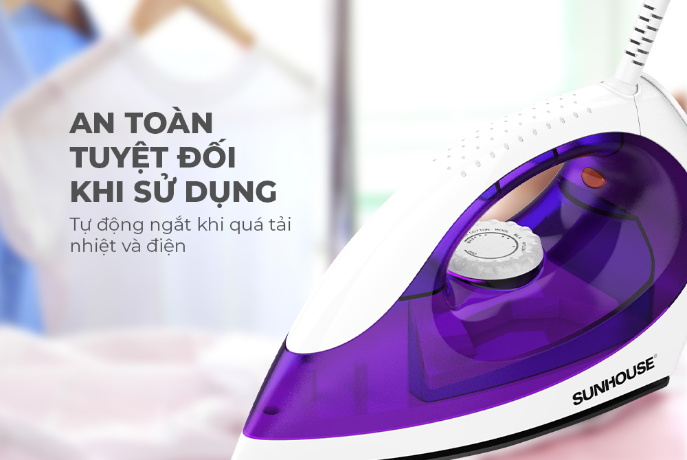- Cảm biến nhiệt đóng ngắt an toàn tuyệt đối khi sử dụng Bàn là khô SUNHOUSE SHD2011 là thiết bị gia dụng thiết yếu trong mỗi gia đình. Với công suất lớn 1200W dễ dàng điều chỉnh bằng núm xoay, mặt bàn là chống dính lướt êm trên mọi mặt vải, dây điện chắc chắn an toàn, sản phẩm có khả năng ủi là nhanh hơn hẳn so với bàn là thường, xóa nhanh các nếp nhăn quần áo mà không làm phai màu, giữ mùi thơm của quần áo lâu dài. THIẾT KẾ HIỆN ĐẠI – TRẺ TRUNG - TIỆN DỤNG