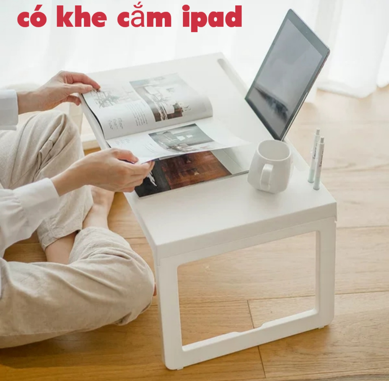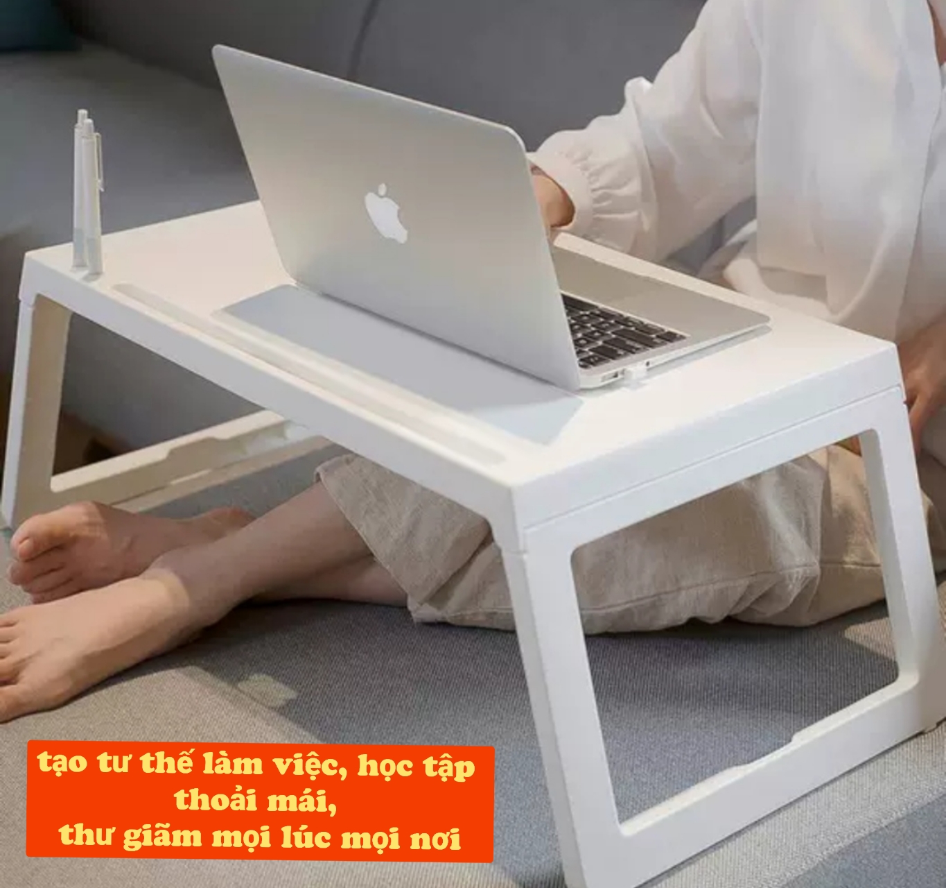 - Chất liệu nhựa PP có độ bền cao, an toàn khi sử dụng. - Bàn có thể gấp gọn thông minh, giúp tiết kiệm không gian và thuận tiện khi di chuyển. - Bàn có khe cắm bút, iPad và lỗ luồn dây sạc, đáp ứng đầy đủ nhu cầu học tập và làm việc. - Chân bàn chắc chắn, có khả năng chịu lực tốt. - Màu sắc nhã nhặn, sang trọng - Gờ nhựa chống trượt ở chân bàn giúp tăng độ ổn định khi sử dụng. - Màu sắc nhã nhặn, sang trọng phù hợp với nhiều độ tuổi, không gian. Hướng dẫn sử dụng