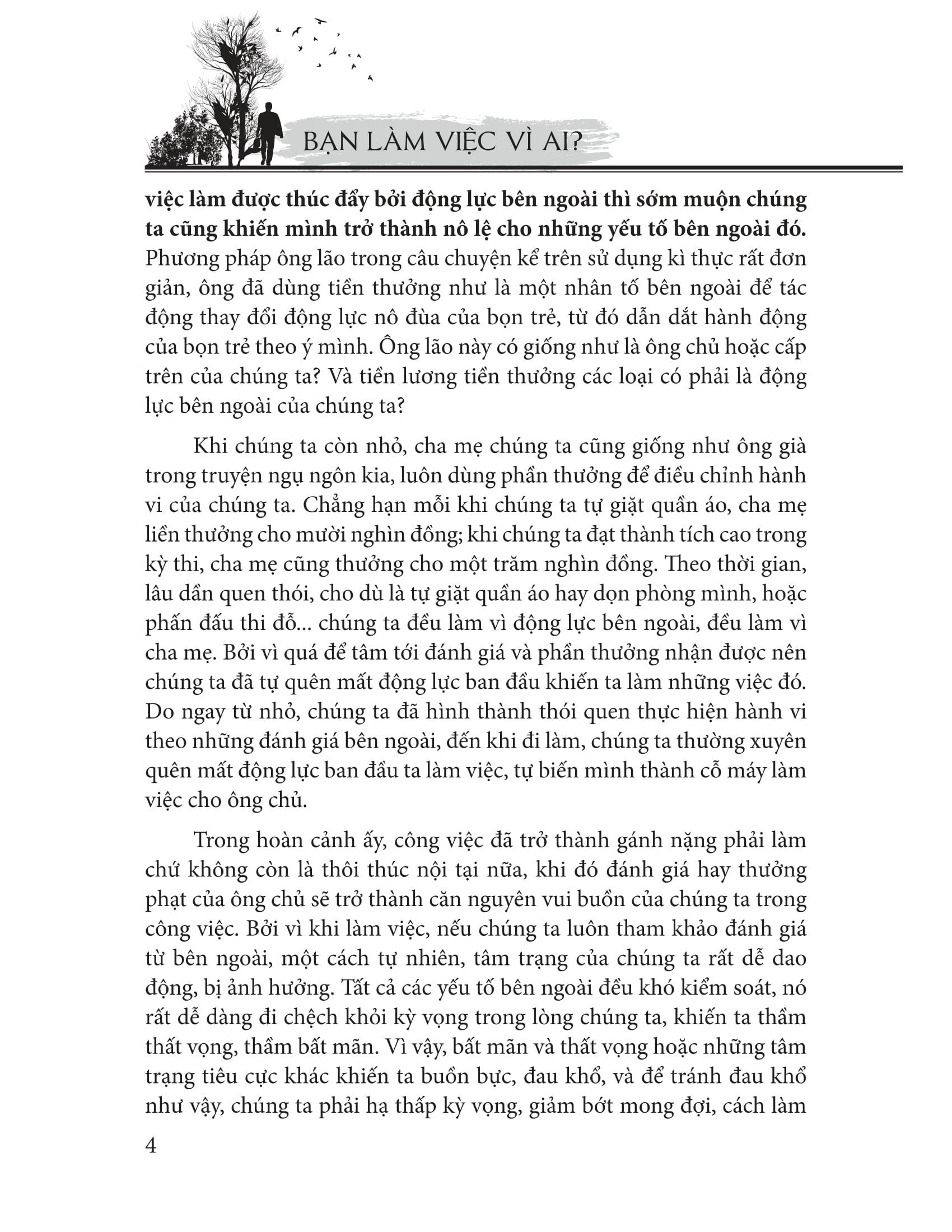 Trong thực tế, bất kể chúng ta làm bất cứ việc gì cũng vì những động lực nhất định. Động lực lại phân thành hai loại: động lực bên trong và động lực bên ngoài. Nếu thống nhất được động lực bên trong với hành động, chúng ta sẽ là chủ nhân của bản thân. Nhưng nếu việc làm được thúc đẩy bởi động lực bên ngoài thì sớm muộn chúng ta cũng khiến mình trở thành nô lệ cho những yếu tố bên ngoài đó.