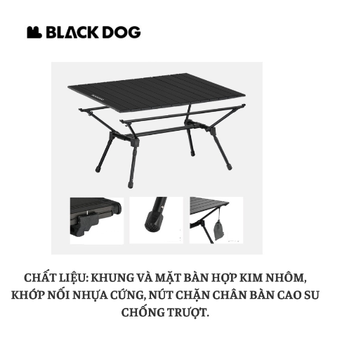 - THÔNG TIN SẢN PHẨM - Thương hiệu: Blackdog - Mã sản phẩm: BD-ZZ003 - Chất liệu: Hợp kim nhôm, khớp nối nhựa cứng và nút chặn chân bàn cao su - Kích thước mặt bàn: 90600.8 cm - Kích thước sử dụng: 906042-53cm - Kích thước gấp gọn: 662512cm - Khối lượng: 4.5 kg - Tải trọng tối đa: 30kg - Màu sắc: Đen - Bộ sản phẩm bao gồm: Bàn và túi đựng - Xuất xứ: Trung Quốc