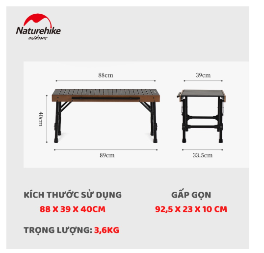 MÔ TẢ SẢN PHẨM - Thương hiệu: NatureHike - Mã sản phầm: NH20JJ020 - Chất liệu: + Mặt bản: Vải Oxford 1680D + Khung bàn: Hợp kim nhôm - Kích thước & Trọng lượng: +