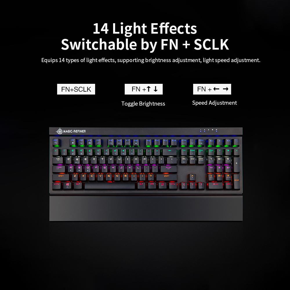 MAGIC-REFINER Mechanical Keyboard is designed for game player. 108 N-keyrollover key and 10 styles cool backlit gives you ultimate game experience.Mechanical blue switch brings quick response and let you enjoy smooth gameplaying. Support both English