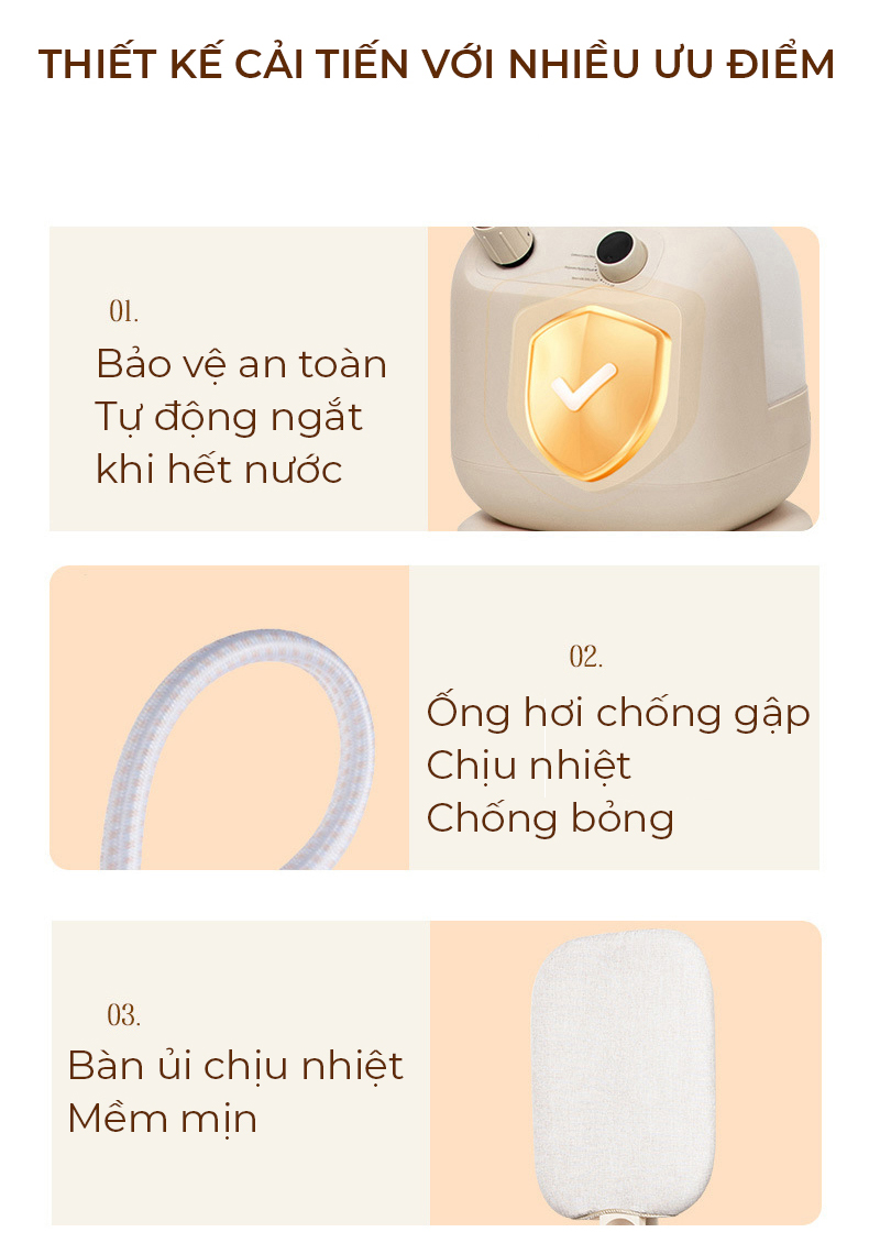 ĐẶC ĐIỂM NỔI BẬT - Thiết kế hiện đại, màu sắc trang nhã, dễ di chuyển và cất giữ. - Công suất 1800W, làm nóng nhanh, tiết kiệm thời gian ủi. - 3 mức điều