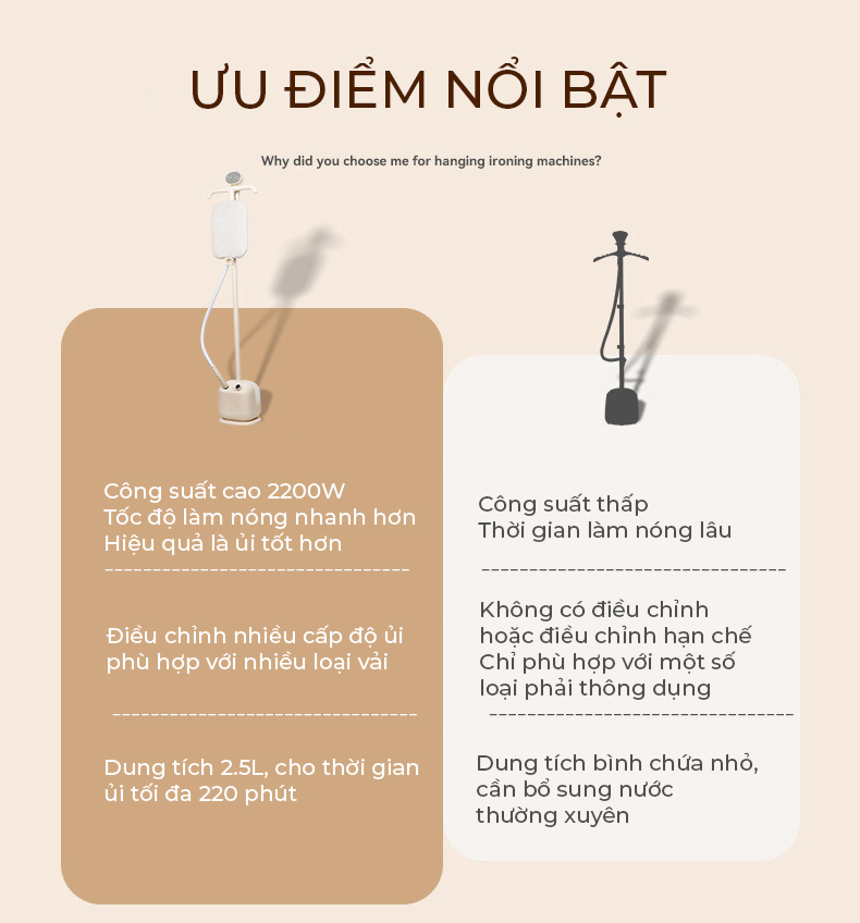 Đặc điểm nổi bật Thiết kế hiện đại, di chuyển dễ dàng nhờ có bánh xe gắn sẵn Công suất 2200W làm nóng nhanh, tiết kiệm thời gian ủi Dung tích bình nước 1200 ml ủi