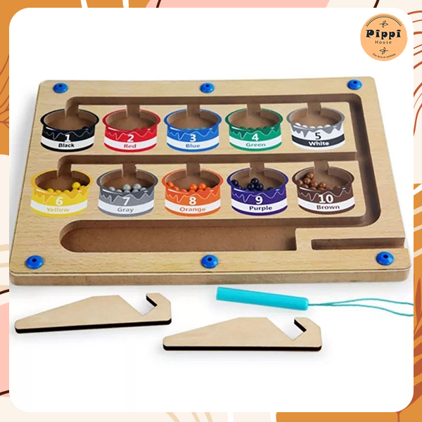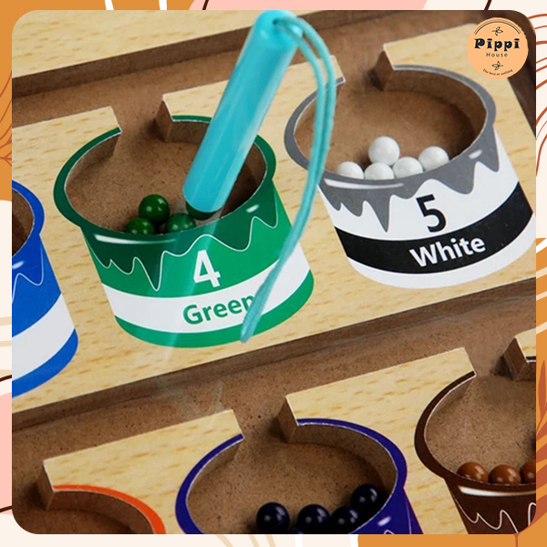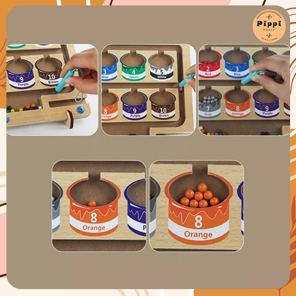 Chưa hết, đây cũng sẽ là công cụ hữu hiệu để trẻ học đếm vì trên từng hũ sẽ có đánh số thứ tự tương ứng với số viên bi cần phải di chuyển. Việc làm quen với màu sắc và số đếm trở nên thú vị hơn bao giờ hết. kích thước bảng: 26.5x19.5x2.5cm