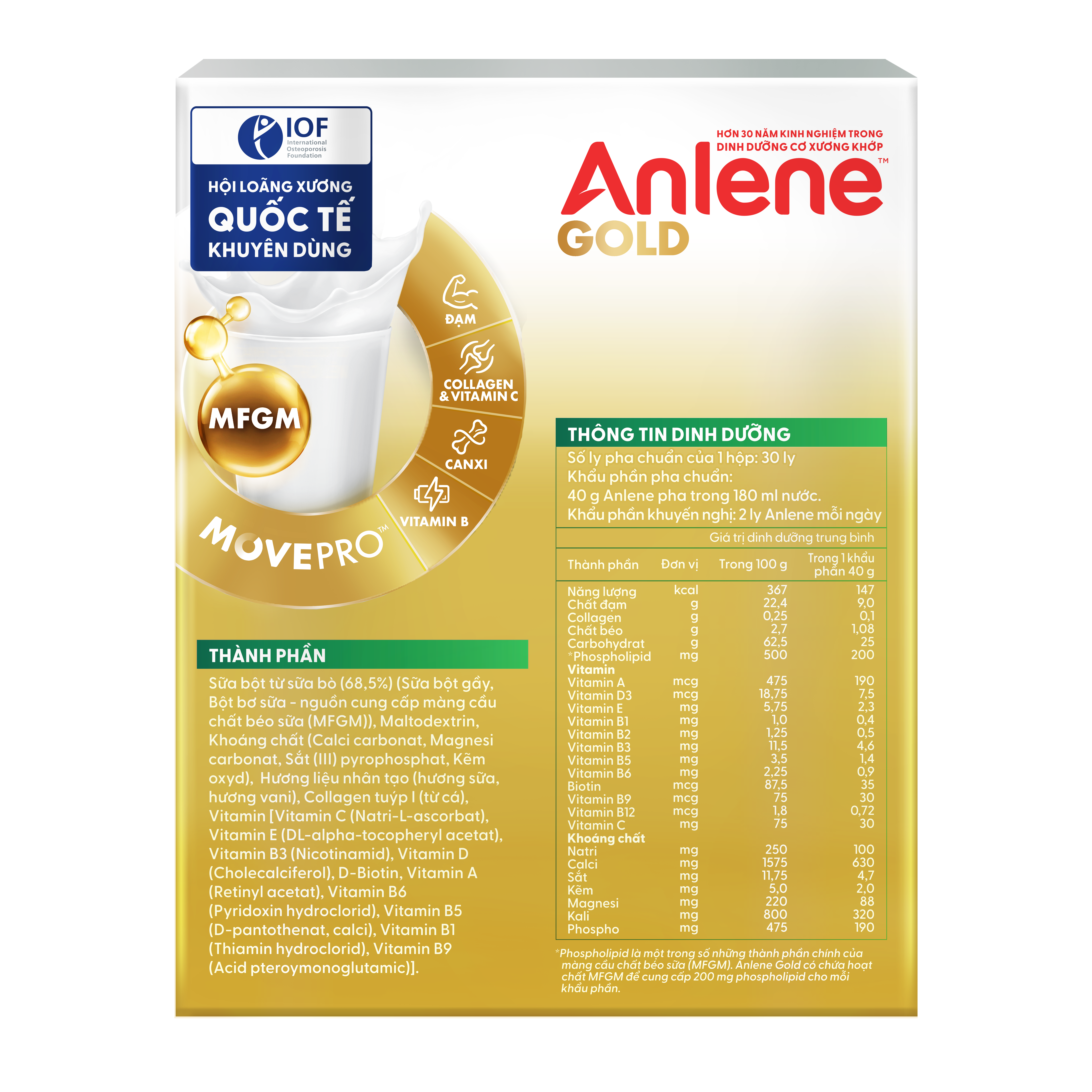 ANLENE GOLD LÀ SẢN PHẨM SỮA CHỨA HỆ DƯỠNG CHẤT MOVEPROCung cấp dinh dưỡng tăng cường với hoạt chất MFGM được KIỂM NGHIỆM LÂM SÀNG, giúp cơ thể thêm linh hoạt và Vitamin B tiếp thêm năng lượng.
