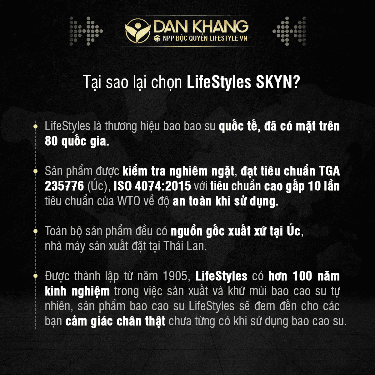 LifeStyles là công ty bao cao su latex được yêu thích và tin dùng nhất trên toàn thế giới. cũng như nhãn hiệu bao cao su non-latex ( không làm từ mủ cao su thiên nhiên ) SKYN.