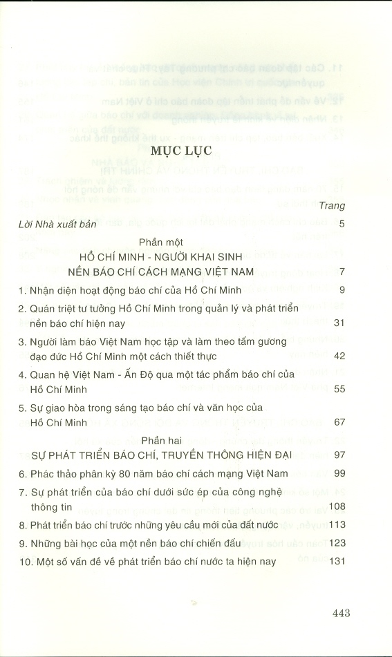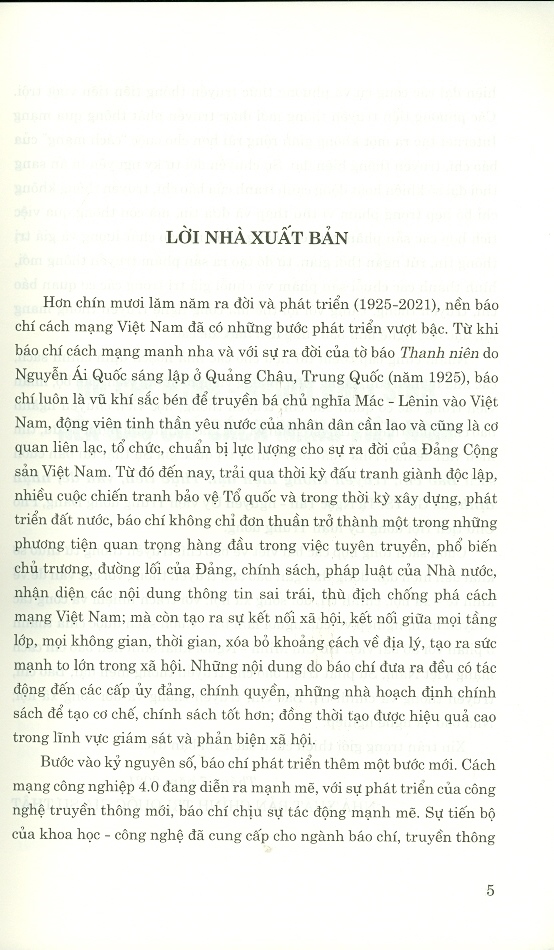 Mua tại TiktokCuốn sách tổng hợp các bài viết về báo chí, truyền thông từ thuở sơ khai đến hiện đại, đồng thời gắn báo chí, truyền thông với các vấn đề về kinh tế – xã hội, chính trị, đời sống xã hội; với trách nhiệm và công tác chuyên môn, nghiệp vụ của người làm báo. Cuốn sách được chia thành 5 phần với 36 bài viết: Hồ Chí Minh – Người khai sinh nền báo chí cách mạng Việt Nam; Sự phát triển báo chí, truyền thông hiện đại; Báo chí truyền thông và chính trị; Báo chí, truyền thông và đời sống xã hội; Nhà báo và nghề nghiệp.