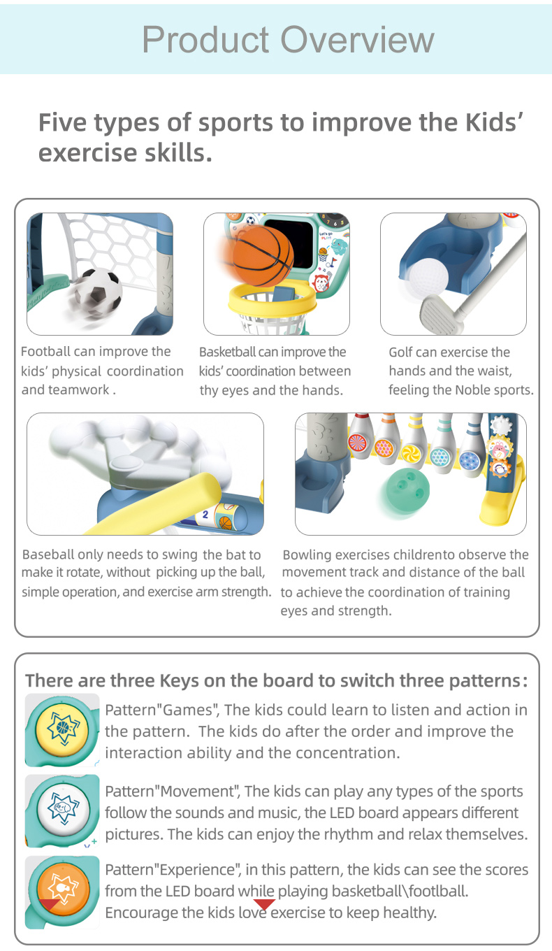 Bộ đồ chơi mô phỏng vận động siêu vui tích hợp 3 môn: bóng đá, bóng rổ và golf mini, giúp bé: Rèn thể lực và kỹ năng phối hợp nhóm. Phát triển phản xạ