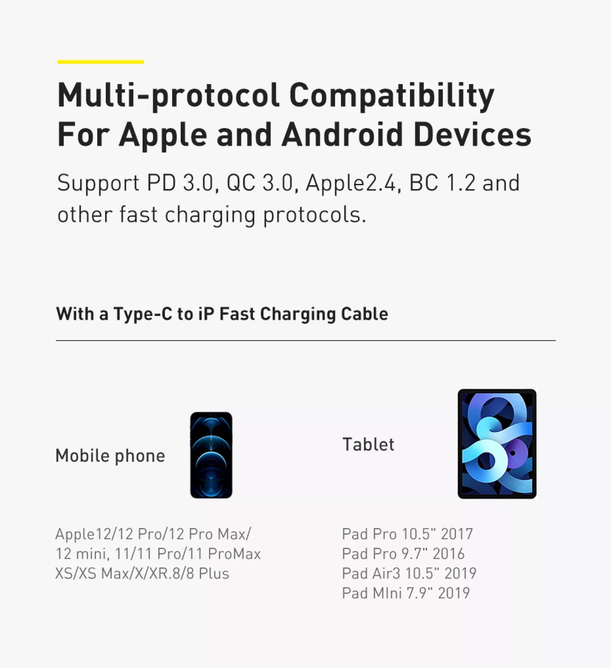 1. Input: 100-240V~50/60Hz 700mA Max 2. Output: 5V/3A 9V/2.77A 12V/2.08A 3. PPS: 3.3~11V/2.25A 4. Total Output Power: 25W Max 5. Compatible with: 6. PD3.0 (PD2.0) 7. QC4.0+ (QC4.0/QC3.0/QC2.0) 8. FCP/AFC/PPS 9. BC1.2--5V1.5A 10. UL, PSE,
