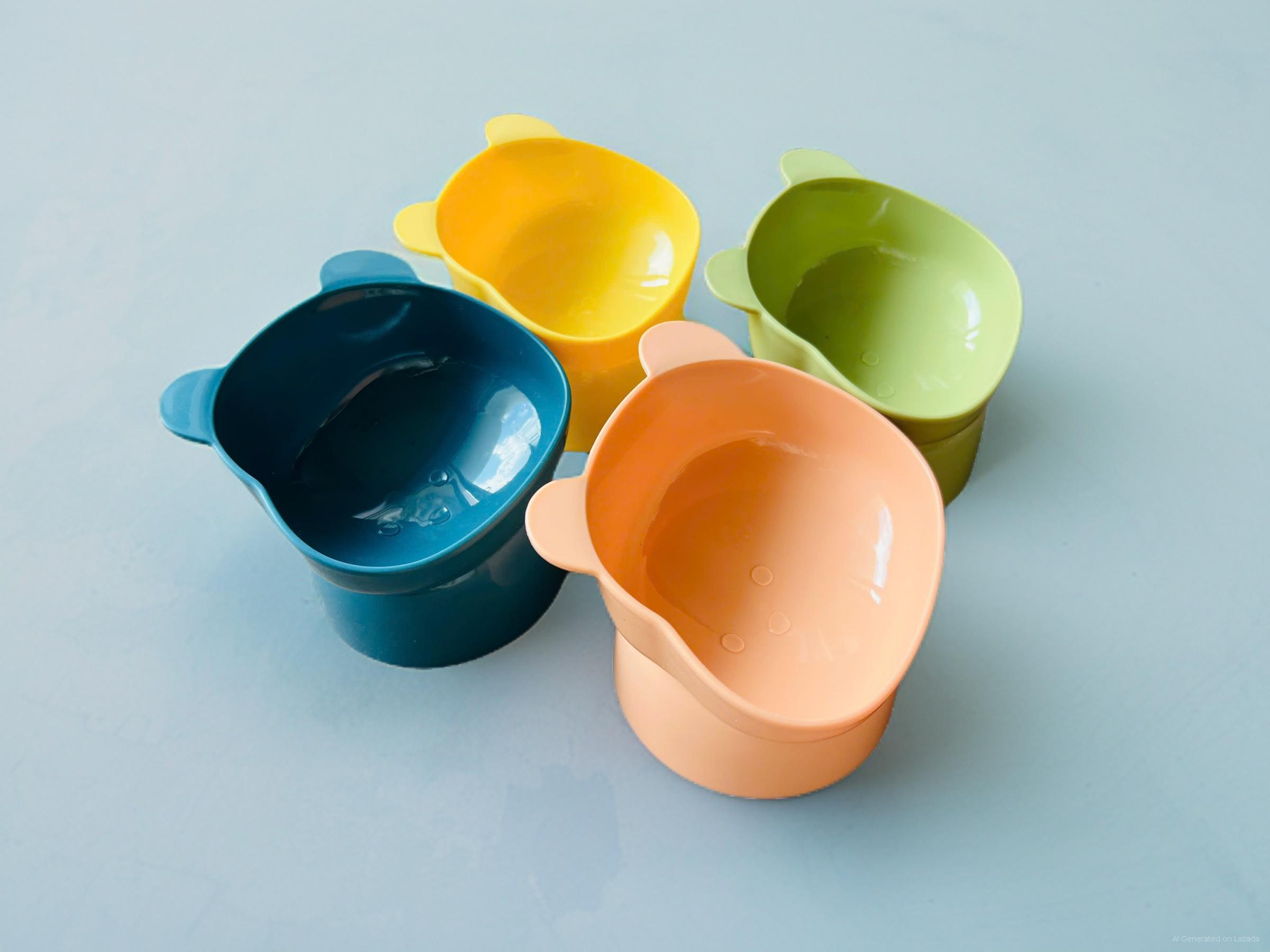 Thiết kế : Bát ăn bằng nhựa, chống gù cho các bé. Chân đế cao giúp bảo vệ cổ cho các bé. Bát ăn rất nhẹ thoải mái cho các bé ăn và uống.