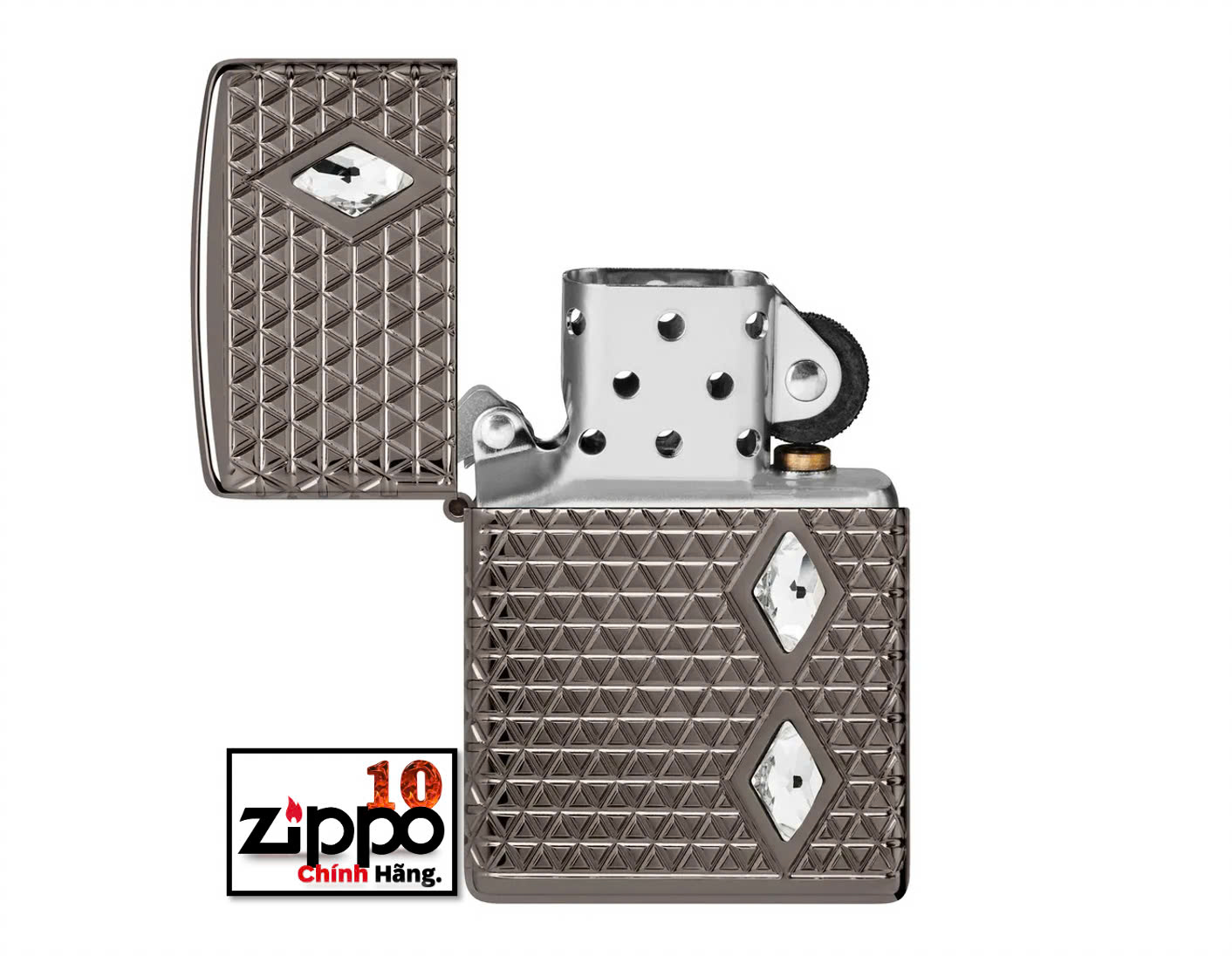Được bao quanh bởi họa tiết kim cương MultiCut thanh lịch, ba viên pha lê lấp lánh lấp lánh trên bề mặt của chiếc bật lửa Armor Black Ice tinh xảo này. Được đóng gói trong một hộp quà tặng và kèm theo hướng dẫn sử dụng. Để có hiệu suất tối ưu, hãy đổ nhiên liệu bật lửa Zippo.