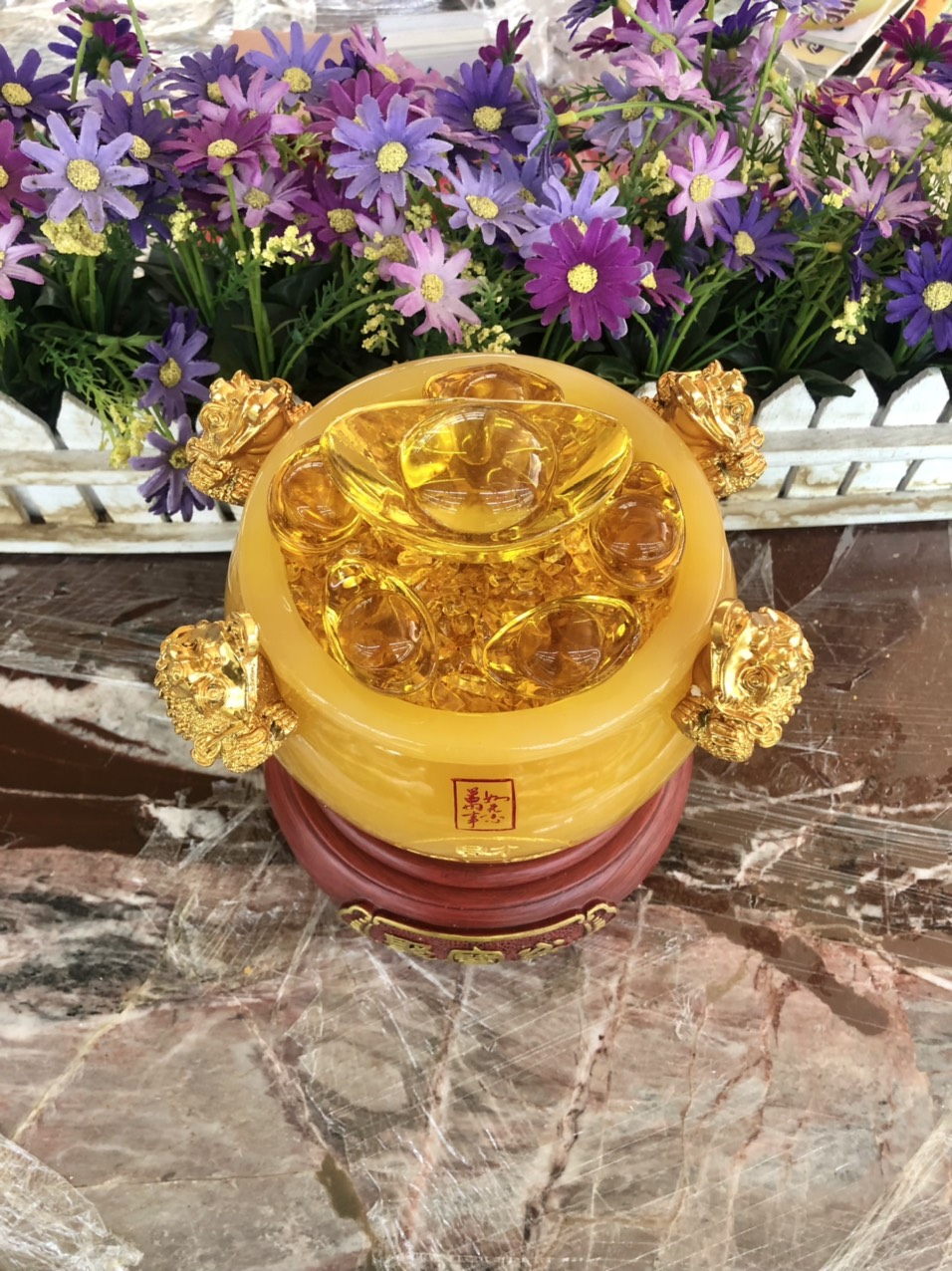 Tượng 1 Bình Hoa Phú Quý Vàng Tươi Sáng Cây Như Ý Đính Dây Chậu Đỏ Vàng đẹp lắm Size cao 30cm đk 15cm hợp mệnh Kim Thổ Thủy trưng trên bàn phòng khách nhà
