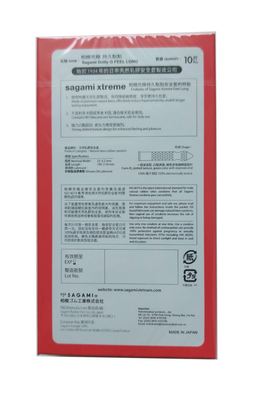- Bao cao su Sagami Super Dot 009 là dòng sản phẩm có gai nhỏ - chấm nổi, một lần thắt, DÀY NHẤT trong các dòng sản phẩm của Sagami – Nhà sản xuất bao cao su đầu tiên tại Nhật Bản. TÍNH NĂNG SẢN PHẨM