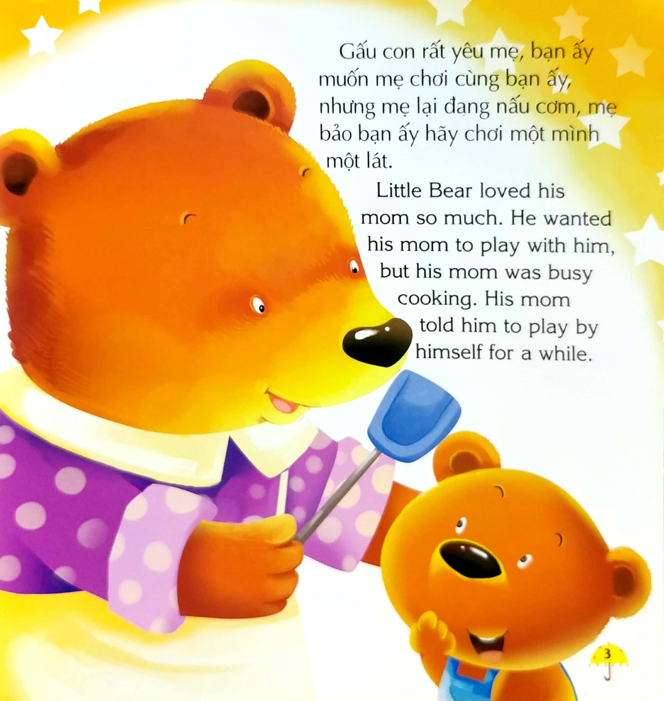 Gấu con rất yêu mẹ. Bạn ấy muốn mẹ chơi cùng mình, nhưng mẹ bạn ấy còn bận nấu cơm nên chưa thể dành thời gian cho bạn ấy ngay được. Thế là bạn ấy đã nghĩ ra một cách để có thể tự chơi một mình mà không làm phiền đến mẹ đấy. Bạn ấy còn chơi rất vui nữa kìa. Bé có đoán được Gấu con đã chơi trò gì không nào? Bé hãy mở cuốn sách này ra để theo dõi câu chuyện của Gấu con và cùng Gấu con học cách yêu thương mẹ của mình nhé