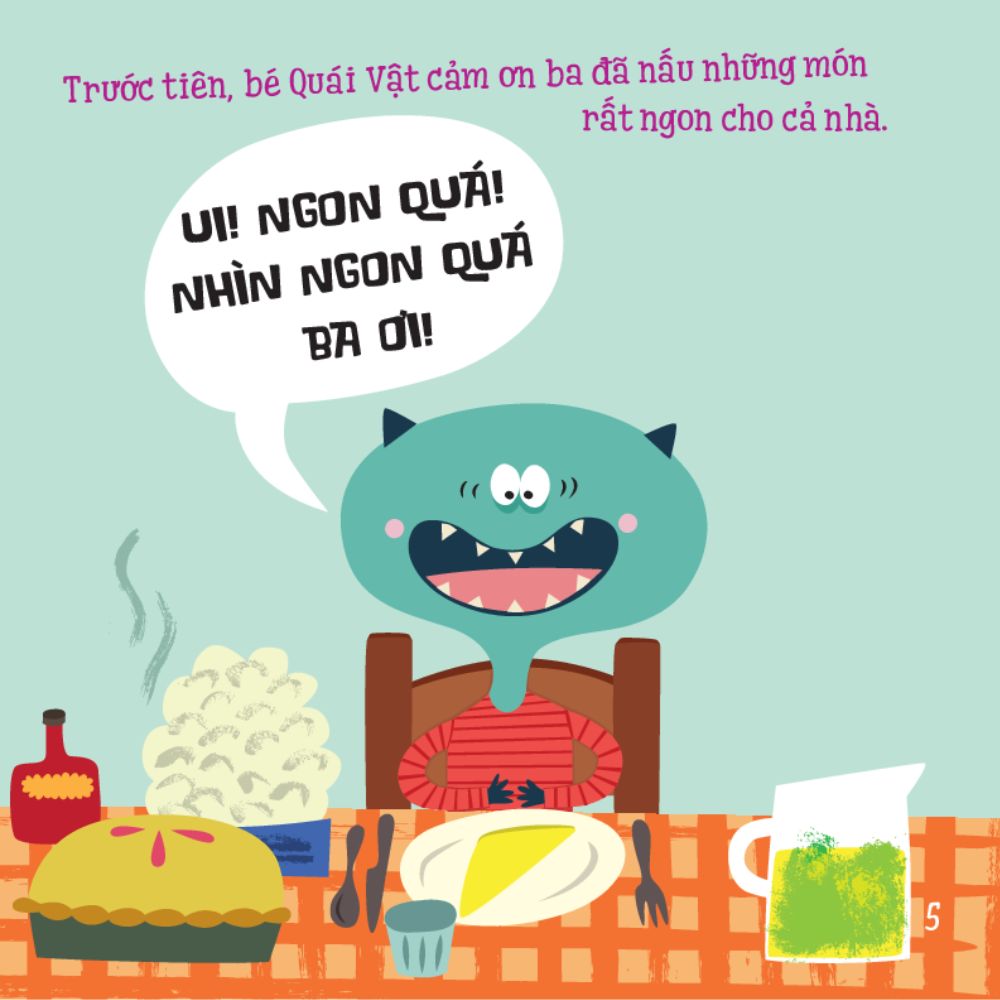 Tóm tắt nội dung Bé Quái Vật biết ngồi bàn ăn: bữa ăn gia đình của Bé Quái Vật, bé không vọc tay vào đồ ăn, không chồm lên bàn, lỡ rơi vãi thì phải làm ăn xong bé tính kiếm cớ chạy chơi nhưng ba mẹ nhắc phải giúp dọn bà