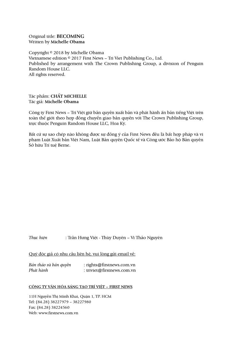 Bản quyền cuốn hồi ký Becoming của đệ nhất phu nhân Michelle Obama được chuyển nhượng cho First News – Trí Việt sau vòng đấu giá và tuyển chọn với giá trị số tiền bản quyền kỷ lục, vượt qua tất cả các tác phẩm của Mỹ được Việt Nam mua bản quyền trong hàng chục năm qua. Đặc biệt, sau khi bản quyền cuốn sách được chuyển nhượng, tựa sách, thiết kế bìa, dàn trang của cuốn sách bản tiếng Việt được chính cựu Đệ nhất Phu nhân Hoa Kỳ Michelle Obama ký duyệt.