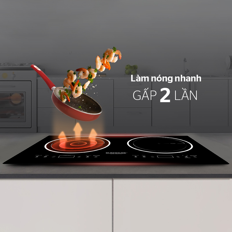 Bếp đôi điện từ SUNHOUSE SHB9003-EC có 2 vùng nấu rộng rãi giúp bạn chế biến được nhiều món ăn cùng lúc. Bạn có thể vừa nấu canh, vừa chiên xào thực phẩm một cách thật thoải mái.