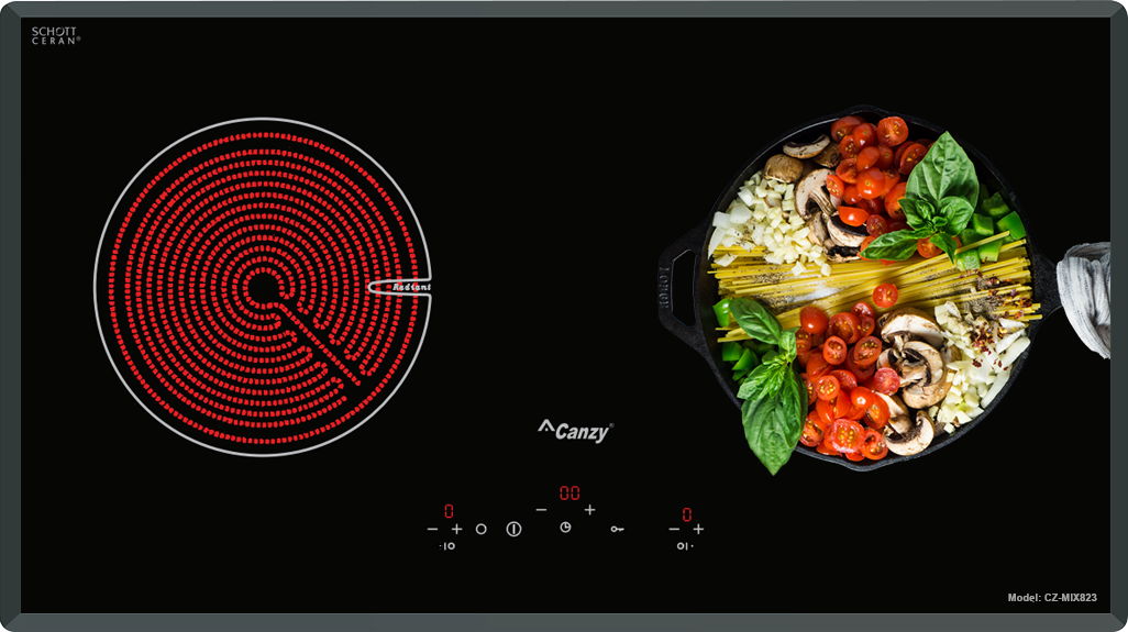 BẾP ĐIỆN TỪ CANZY CZ-MIX823 | NHẬP KHẨU NGUYÊN CHIẾC TỪ TÂY BAN NHA | THIẾT KẾ SANG TRỌNG | HỆ ĐIỀU KHIỂN CẢM ỨNG SIÊU NHẠY | AN TOÀN, BỀN BỈ VÀ TIẾT KIỆM ĐIỆN NĂNG Bếp điện từ Canzy CZ-MIX823 chính hãng nhập khẩu nguyên chiếc từ Tây Ban Nha đang là một trong những dòng bếp điện từ đang được nhiều khách hàng lựa chọn trong thời gian gần đây. Sản phẩm được kiểm tra nghiêm ngặt trước xuất ra ngoài thị trường. Bếp điện từ Canzy CZ-MIX823 sử dụng mặt kính Schott Ceran được làm từ chất liệu gốm thủy tinh có khả năng chịu nhiệt lên đến 1000°C, kháng sốc 750°C. Bề mặt kính chịu nóng lạnh cũng như sự thay đổi đột ngột của nhiệt độ. Độ giãn nở vì nhiệt thấp nên bếp hoạt động rất hiệu quả và cách nhiệt. Mặt bếp tản nhiệt nhanh và được cách điện an toàn với các linh kiện điện tử bên trong thân. Bạn có thể yên tâm sử dụng mà không lo bị bỏng hay điện giật. Đây là mặt kính chuyên dụng dành cho bếp điện từ, là một loại kính có chất lượng cao, rất cứng, bền và có nhiều đặc điểm nổi trội như: khả năng chịu nhiệt, khả năng chống trầy xước và chống va đập Mặt kính gồm các thấu kính hội tụ, truyền nhiệt từ bếp lên đáy nồi theo phương thẳng đứng, không thất thoát nhiệt ra môi trường. Mặt kính màu xám liền nguyên khối, an toàn, thẩm mỹ và tiện trong việc vệ sinh, lau chùi.   THÔNG TIN BẾP ĐIỆN TỪ CANZY CZ-MIX823 Bếp điện từ Canzy CZ-MIX823 gồm 2 vùng nấu với tổng công suất 3900W, vùng nấu từ phải với công suất là 1500W khi kích hoạt tính năng nấu siêu nhanh Booster công suất lên tới 2000W, vùng nấu hồng ngoại phải sử dụng mâm nhiệt Copreci Radiant 2 vòng nhiệt với vòng nấu nhỏ bên bếp hồng ngoại có công suất 800W và vòng nấu lớn của bếp hồng ngoại có công suất 1900W. Bếp điện từ Canzy CZ-MIX823 với công nghệ Inverter thông minh vượt trội: giúp làm giảm lượng tiêu thụ điện của các sản phẩm có sử dụng lõi từ của bếp từ. Ngoài ra công nghệ Inverter còn giúp bếp từ điều chỉnh mức công suất phù hợp để không làm tiêu thụ nhiều điện năng. Bếp điện từ Canzy CZ-MIX823 với cảm biến thông minh sẽ cố định công suất tiêu thụ điện khi đun nấu, không bật tắt liên tục như các bếp từ thông thường khác (tự động điều chỉnh liên tục để đảm bảo mức nhiệt tương đương bằng với con số hiển thị trên bàn điều khiển). Bạn có thể tận dụng các loại xoong, nồi vì bếp điện không kén nồi, phù hợp với nhiều kích cỡ. Ưu điểm của bếp điện hơn hẳn các sản phẩm khác là có thể nướng trực tiếp lên bề mặt. Nướng thịt, rau củ, hải sản thơm ngon. Bạn nên vệ sinh sạch sẽ mặt bếp sau khi sử dụng. Hoạt động của bếp điện là truyền nhiệt lên mặt kính rồi mới lên đáy nồi nên mặt kính bếp rất nóng. Sau khi nấu, bạn có thể tận dụng hâm nóng thức ăn trên bếp. Ngược lại với vùng điện, bếp từ chỉ hơi nóng vùng nấu. Hiệu suất nấu lên tới 90%. Chức năng nhận diện vùng nấu chỉ sinh nhiệt vùng đáy nồi, tránh nồi thất thoát nhiệt ra ngoài. Bếp điện từ Canzy CZ-MIX823 được tích hợp chức năng tự nhận diện vùng nấu, khi ta đặt nồi lên 1 trong 2 vùng nấu sau đó ấn nút khởi động bếp sau thời gian 1-2 giây bếp sẽ tự động tìm vùng nấu đã có nồi, ta chỉ việc điều chỉnh mức công suất to nhỏ theo ý muốn mà không phải thao tác chọn vùng nấu như bếp thông thường. Công nghệ Inverter được áp dụng trên Bếp điện từ Canzy CZ-MIX823 có khả năng phản ứng thay đổi công suất theo điều khiển ngay tức thì, khi người dùng điều chỉnh tăng giảm nhiệt độ đun nấu, bếp điều chỉnh thay đổi tức thì về mức nhiệt độ mong muốn. Bếp điện từ Canzy CZ-MIX823 sử dụng bảng điều khiển cảm ứng Touch Select hiện đại với 9 cấp độ công suất nhiệt độ khác nhau, điều khiển dễ dàng bằng một ngón tay, mọi chương trình nấu đều được hiển thị qua đèn Led sắc nét để bạn điều chỉnh cho phù hợp với các món ăn. Phần thân vỏ của Bếp điện từ Canzy CZ-MIX823 sử dụng chất liệu thép chống rỉ. Đây là chất liệu có khả năng chống lại quá trình oxi hóa và rò rỉ điện nên rất an toàn cho người sử dụng và thích hợp với khí hậu nhiệt đới gió mùa tại Việt Nam.   TÍNH NĂNG AN TOÀN BẾP ĐIỆN TỪ CANZY CZ-MIX823 Chức năng khóa trẻ em Child Lock: Nhấn và giữ phím khóa trong vòng 3 giây để kích hoạt khóa trẻ em, các phím khác sẽ không sử dụng được (trừ phím nguồn), để mở khóa nhấn và giữ phím khóa 3 giây để mở lại. Chức năng này để bảo vệ hoạt động của bếp trước các hoạt động vô tình bấm phím của trẻ em trong quá trình nấu. Chức năng chống trào nước Water overflow: Khi có nước sôi vô tình tràn trong khi nấu, nước tràn đến khu vực bàn phím điều khiển, sau khoảng 3-5 giây bếp sẽ tự động ngừng hoạt động để đảm bảo an toàn. Chức năng tự động tắt bếp khi không có nồi: Trong