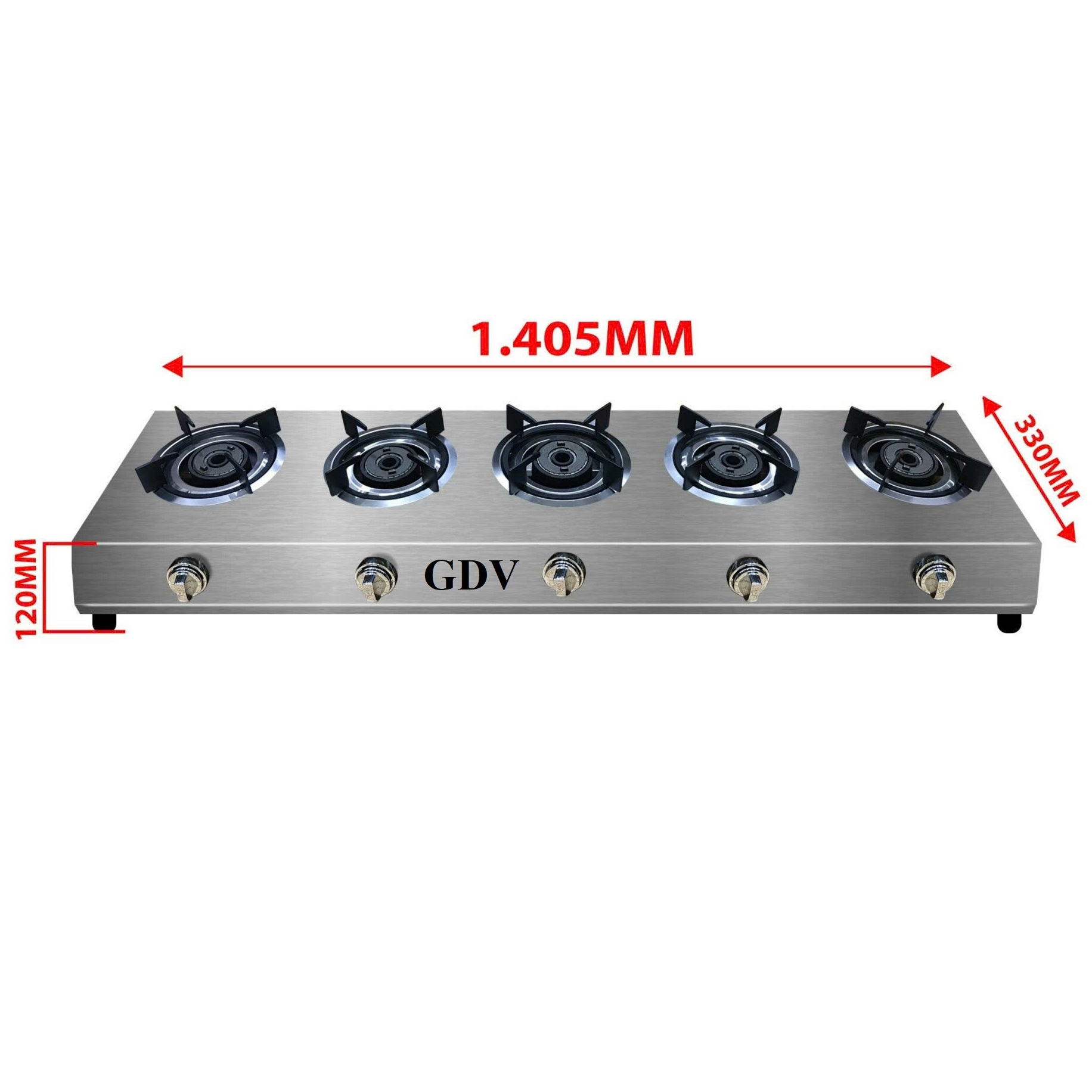 Bếp Gas Khè Bán Công Nghiệp Inox GDV 5 Lò Đốt Chuyên Mỳ Cay, Bánh Xèo - Hàng Chính Hãng có 5 lò đun, điều khiển lửa to nhỏ bằng núm vặn tiện lợi.
