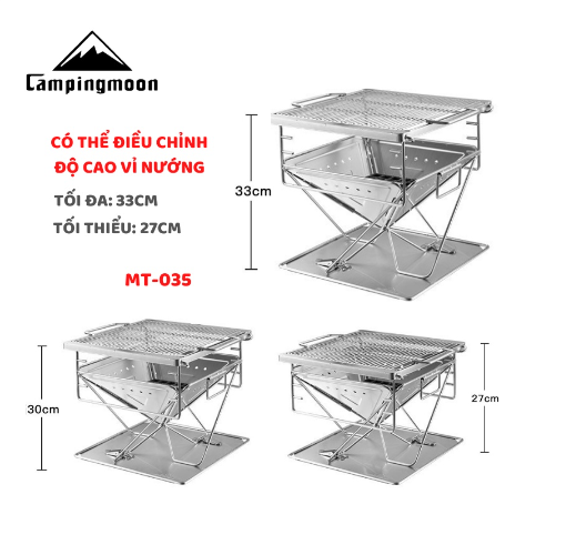 MÔ TẢ SẢN PHẨM BẾP NƯỚNG THAN HOA GẤP GỌN CHO 5-8 NGƯỜI CAMPINGMOON MT-3 * THÔNG TIN SẢN PHẨM: - Thương hiệu: Campingmoon - Mã sản phẩm: MT-3 - Chất liệu: stainless steel, iron