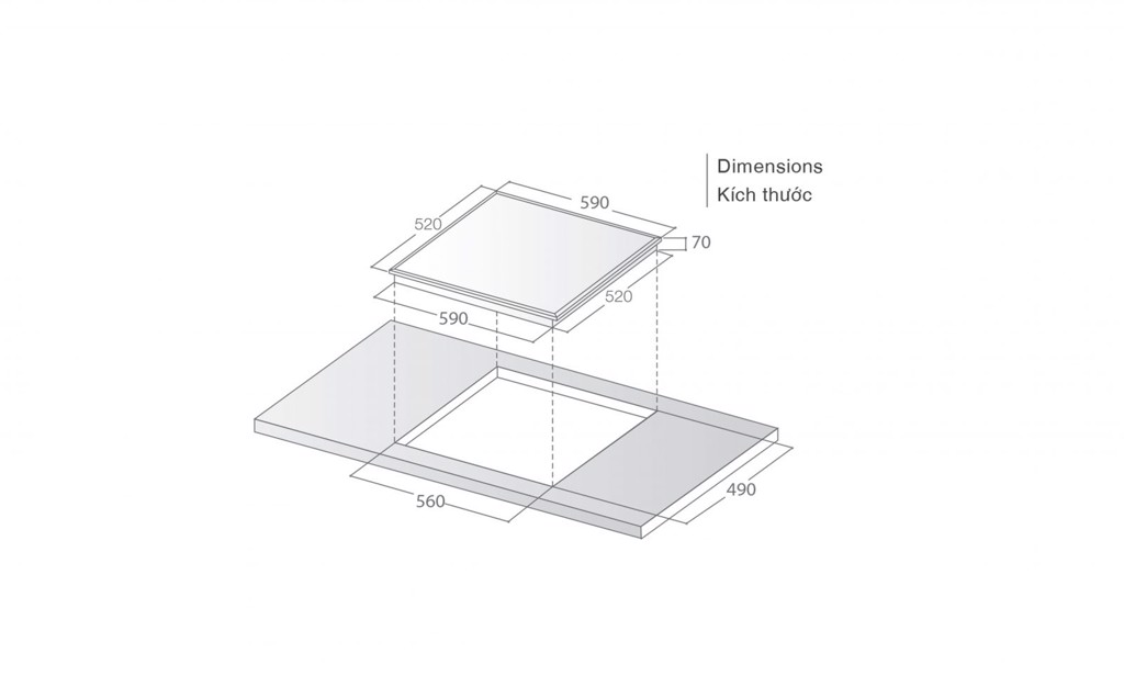 Kích thước khoét đá: 560 x 490mm