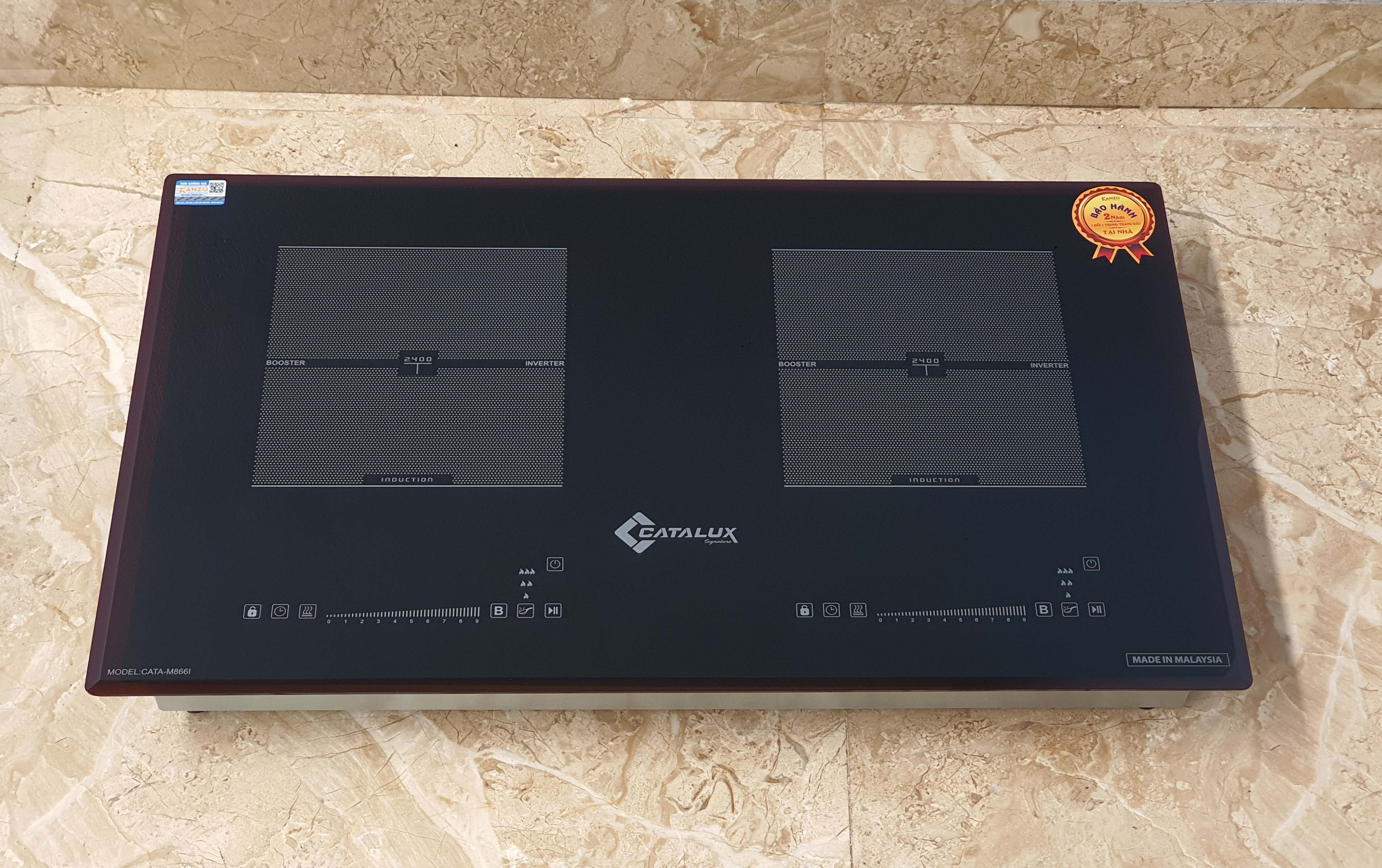 Thiết kế hiện đại, trang nhãBếp điện từ đôi CATA -–M866I MALAYSIA được thiết kế hiện đại, màu sắc trang nhã, đẹp mắt phù hợp với mọi không gian bếp trong gia đình bạn. Thiết kế mặt kính màu đen tinh tế ,dày dặn, sáng bóng, chịu nhiệt và chịu lực hoàn hảo đảm bảo an toàn khi nấu. Chất liệu kính sáng bóng, hạn chế trầy xước, dễ dàng làm sạch. Thiết kế 2 mâm nhiệt tiện lợi giúp bạn dễ dàng chế biến nhiều món ăn khác nhau