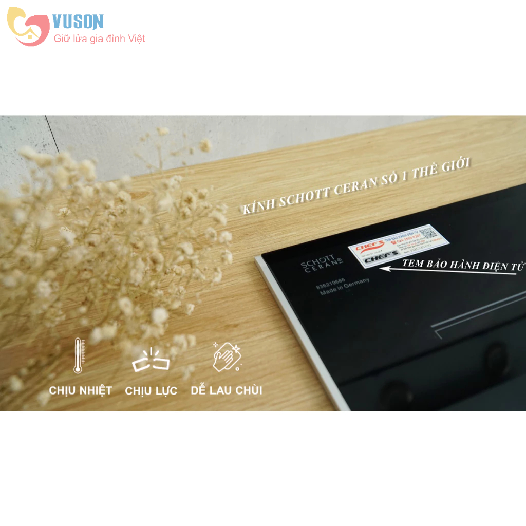 • Bếp 01 từ 01 điện • Mặt kính Schott Ceran Made in Germany siêu bền, chịu lực chịu sốc nhiệt • Đầu đốt và bo mạch EGO Made in Germany • Công nghệ biến