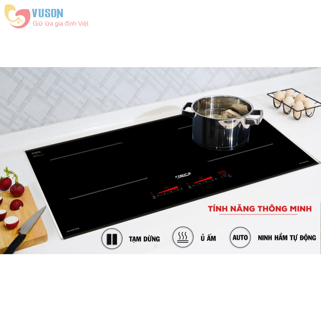 TÍNH NĂNG SẢN PHẨM Bếp đôi: 2 từ Công nghệ biến tần E.G.O Germany Inverter tiết kiệm 30% điện năng Tính năng hâm nóng ở nhiệt độ thấp Warm: 400C,600C,700C Tính năng tạm dừng khi