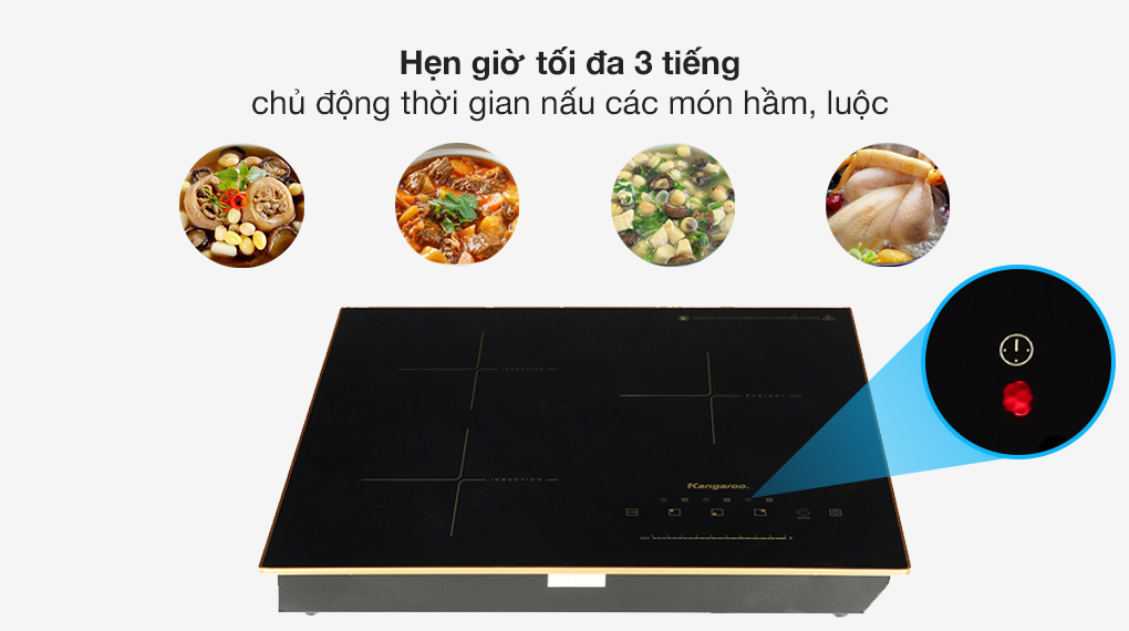 Bếp từ Kangaroo hỗ trợ chức năng hẹn giờ tối đa lên đến 3 tiếng, kiểm soát thời gian nấu linh hoạt với từng nguyên liệu, công thức cho món ăn chín chuẩn vị