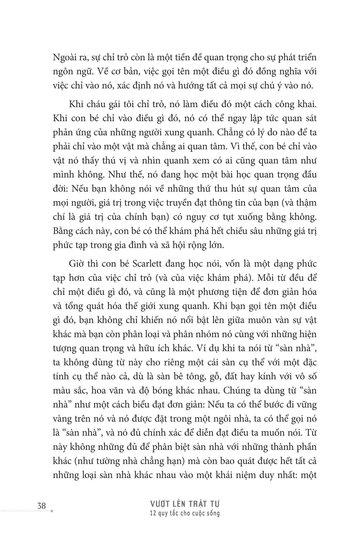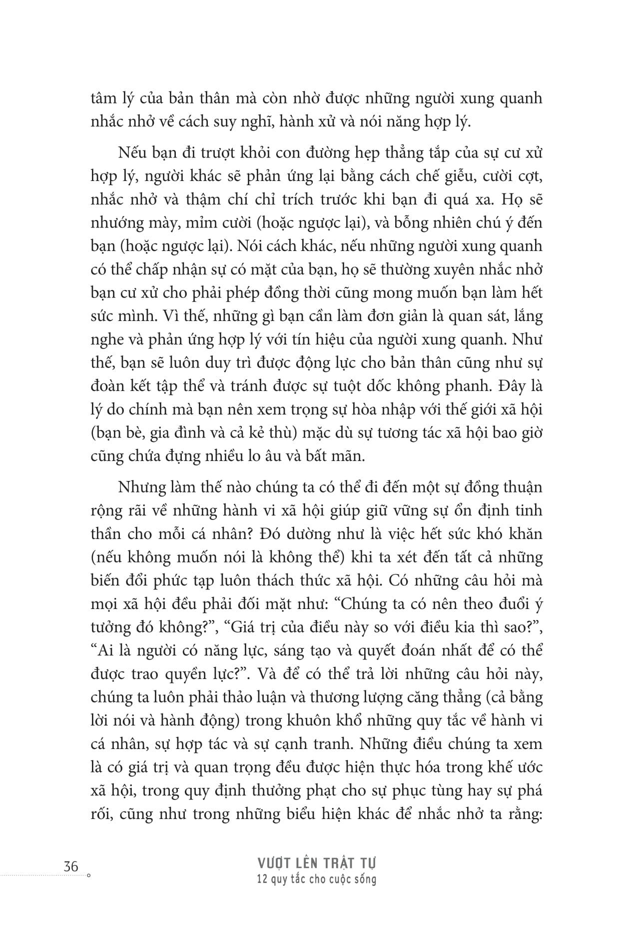 Vậy là cuốn sách tiếp – Vượt Lên Trật Tự của Giáo sư Jordan Peterson ra đời như một liều thuốc giải giúp bạn giải quyết những biến động, rối loạn và bất định. Vẫn là 12 quy luật, nhưng khác với “12 rules for life”, 12 bộ quy tắc củhư một “cứu cánh” giúp bạn nhận ra rằng trật tự thực ra rất mong manh, rằng “Con người vốn yếu đuối. Vì thế, cuộc sống luôn khó khăn và đau khổ thì đầy rẫy.” Và “để xoa dịu những khổ đau đó (như đảm bảo mọi người đều có đủ thức ăn, nước sạch và một nơi ở đàng hoàng, sạch sẽ), chúng ta cần đến sự mạnh dạn sáng tạo, nỗ lực và năng lực.”