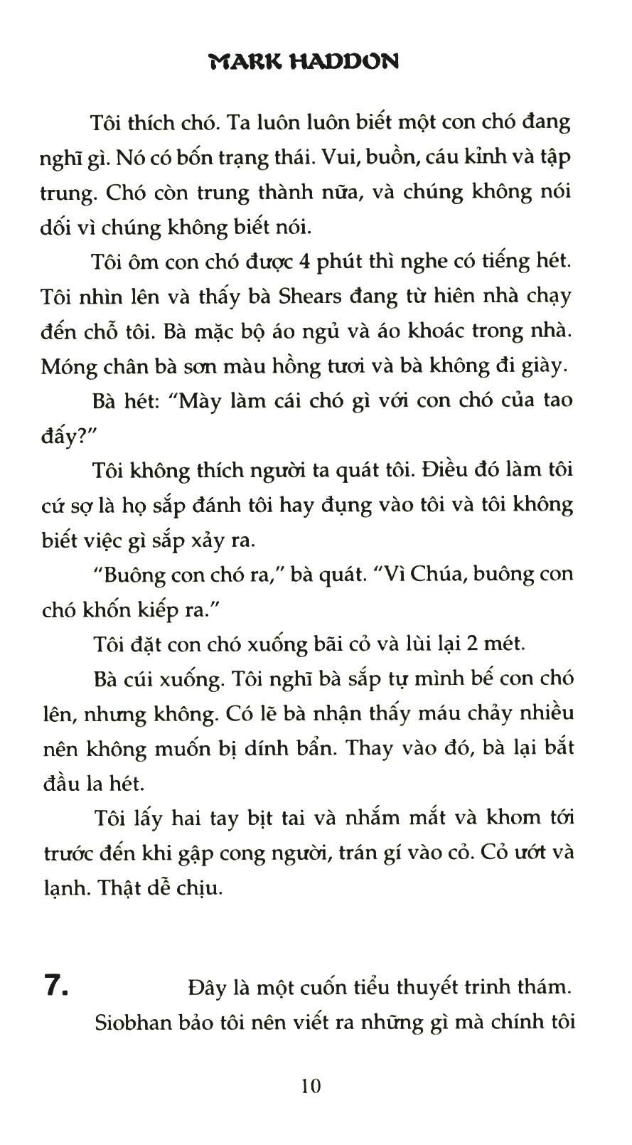 Nếu bạn thuộc tất cả những số nguyên tố cho tới 7057, biết tất cả các nước cùng thủ đô của chúng và giết thời giờ bằng cách giải phương trình bậc hai không cần giấy bút, rất có thể người ta sẽ gọi bạn là thần đồng. Nhưng nếu bạn lại còn không hiểu được xúc cảm của người khác mà chỉ thân thiết với động vật, chỉ thấy an toàn khi đi trên một đường nhất định, và hễ bối rối thì chúi đầu xuống đất mà rên rỉ hay đập phá đồ đạc, như Christopher John Francis Boone, thì chắc chắn người ta sẽ nhìn bạn bằng con mắt đặc biệt. Nhất là khi người ta bắt gặp bạn, lúc nửa đêm, ôm con chó bị giết chết trong sân nhà hàng xóm, ngay cạnh ngôi nhà của bạn, đã hai năm nay chỉ còn có bố.