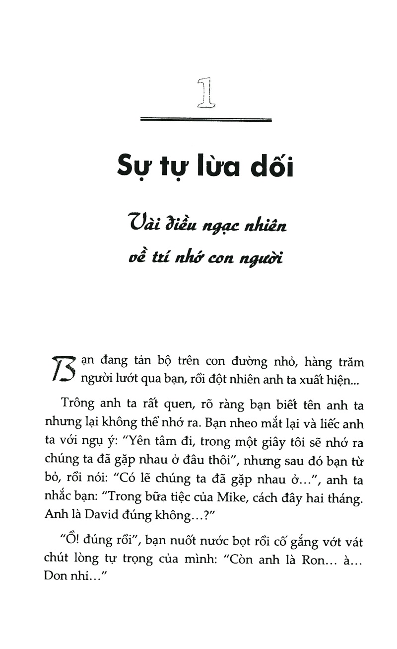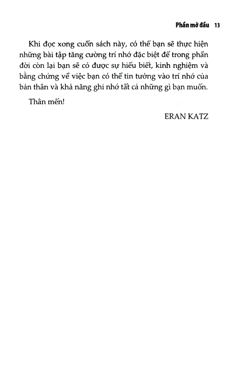 Bí Mật Của Một Trí Nhớ Siêu Phàm Cuốn sách Kinh điển về Tư duy, Kỹ năng mà bất cứ ai cũng nên đọc. Phần lớn chúng ta cho đến cuối đời đều chỉ sử dụng được khoảng 10% khả năng ghi nhớ của mình… Và để nhớ mọi thứ thật lâu, lời khuyên của tôi là: Mỗi người hãy nhận thức lại cuộc sống để thấy cuộc sống của chúng ta thật đáng quý. Nhiệt tình với mọi điều trong cuộc sống, mọi thứ với chúng ta sẽ thật dễ nhớ. Ngày nay, chúng ta thường quá phụ thuộc vào máy móc công nghệ để ghi nhớ những gì mình muốn; thậm chí chúng ta còn có những quan niệm hết sức sai lầm về trí nhớ của mình. Ví dụ, bạn thành thật thú nhận rằng trí nhớ của mình rất tồi tệ. Và bạn thường biện hộ rằng bạn chỉ là “người trần mắt thịt” nên việc “quên quên nhớ nhớ” là điều hết sức bình thường. Và bạn không hề nghĩ rằng: “Trí nhớ cũng có thể cải thiện được”. Bạn thường thú nhận: Mình chỉ có thể nhớ được 10% tên của những người mà mình đã gặp. Thực tế là, bạn thường rất ấn tượng với diện mạo của người khác, nhưng lại không bao giờ liên hệ nó với một cái tên. Bạn thường thú nhận: Mình chỉ có thể nhớ được 1% số điện thoại của người thân, bạn bè, đồng nghiệp. Thực tế là: bạn không thật sự chủ động ghi nhớ những con số. Bạn cho rằng bộ nhớ bị lão hóa theo thời gian. Thực tế là: Trí nhớ chỉ thật sự giảm sút khi bạn không sử dụng nó thường xuyên. Nếu có sự tập luyện, trí nhớ sẽ liên tục được cải thiện. Với cuốn sách Bí Mật Của Một Trí Nhớ Siêu Phàm, tác giả Eran Katz giúp bạn khẳng định: Trí nhớ của bạn tốt hơn bạn tưởng rất nhiều! Điều nghịch lý là bạn thường không tin vào trí nhớ của mình, cho rằng mình sinh ra đã có một trí nhớ không hoàn hảo, rồi bị động chung sống với nó suốt đời. Do đó, điều bạn cần làm ngay là thay đổi quan niệm sai lầm này. Eran Katz đưa ra những phương pháp ghi nhớ và một hệ thống các bài luyện tập tăng cường trí nhớ đặc biệt, để giúp bạn ghi nhớ tất cả những gì bạn muốn. Trong đó, một cách thức thông dụng mà ông thường xuyên áp dụng cho bản thân là phương pháp liên tưởng. Ông nói rằng: “Từ hàng nghìn năm trước người La Mã cổ đại đã phát hiện ra rằng, muốn có trí nhớ tốt thì phải biết liên tưởng, càng có những liên tưởng đặc biệt, chúng ta càng dễ nhớ mọi việc”.