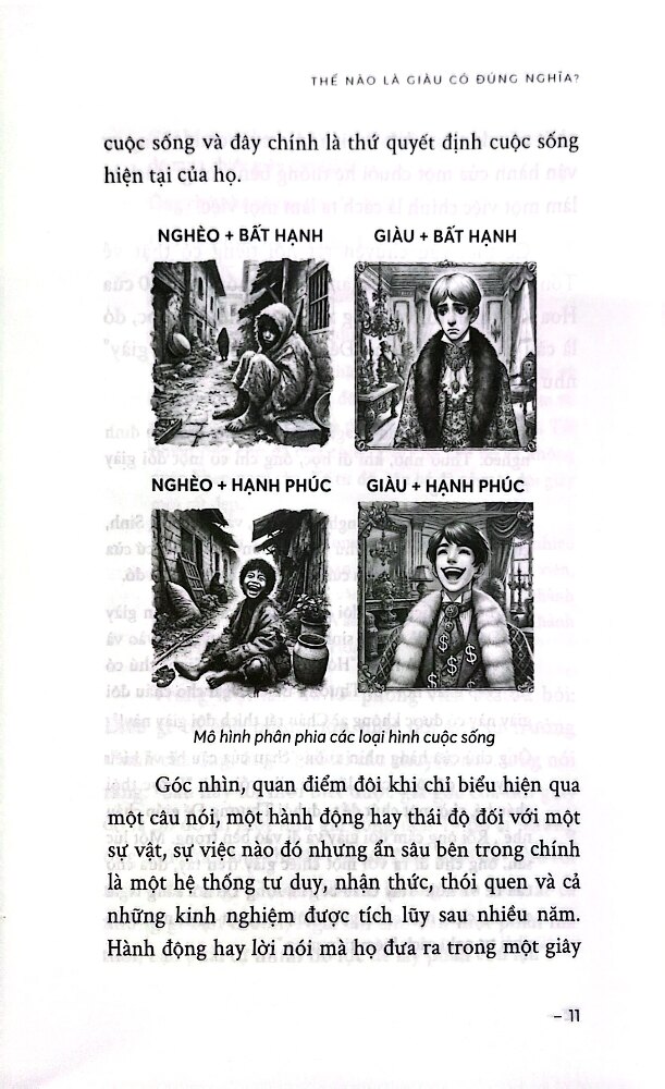 Mặc dù hầu hết đều hiểu và quan niệm một cách khái quát rằng: Người giàu (hay giàu có) là người có nhiều tiền, sở hữu nhiều tài sản vật chất có giá trị và người nghèo thì ngược lại. Độ giàu có hay nghèo khó tăng giảm căn cứ vào tiền và tài sản mà mỗi người sở hữu. Cũng chính vì quan niệm này mà có những tư tưởng sai lệch xuất hiện trong xã hội, coi trọng những người có nhiều tiền và coi thường những người không có hoặc có ít tiền, cũng từ đó tạo ra sự phân biệt đối xử, khoảng cách lớn giữa các thành phần xã hội. Và điều này vô hình chung tạo ra những hệ lụy, mặt trái của xã hội như: con người sẵn sàng tìm mọi cách kiếm thật nhiều tiền để được bước chân vào “giới thượng lưu” bất chấp cả những việc làm trái pháp luật, trái lương tâm, trái đạo đức. Cứ như vậy, xã hội càng phát triển về vật chất thì đạo đức con người lại càng xuống cấp nghiêm trọng, để rồi con người ta lại đổ lỗi cho sự bạc bẽo của đồng tiền. Nhưng sự bạc bẽo ấy có phải xuất phát từ đồng tiền - một phương tiện của cuộc sống hay xuất phát từ chính tâm tham lam, mong cầu, muốn thỏa mãn hư danh của con người mà sâu xa hơn là từ nhận thức sai lệch về khái niệm thực sự của “sự giàu có”?