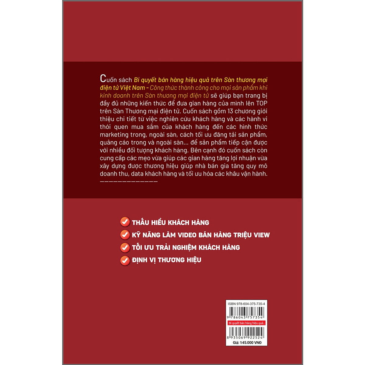 Mua tại TiktokCuốn sách Bí quyết bán hàng hiệu quả trên Sàn thương mại điện tử - Công thức thành công cho mọi sản phẩm sẽ giúp bạn trang bị đầy đủ những kiến thức để đưa gian hàng của mình lên TOP trên Sàn Thương mại điện tử. Cuốn sách gồm 13 chương giới thiệu từ việc nghiên cứu khách hàng và các hành vi thói quen mua sắm của khách hàng đến các hình thức marketing trong, ngoài sàn, cách tối ưu đăng tải sản phẩm…. để sản phẩm tiếp cận được với nhiều đối tượng khách hàng. Bên cạnh đó cuốn sách còn cung cấp các mẹo vừa giúp các gian hàng tăng doanh thu và lợi nhuận vừa xây dựng được thương hiệu.