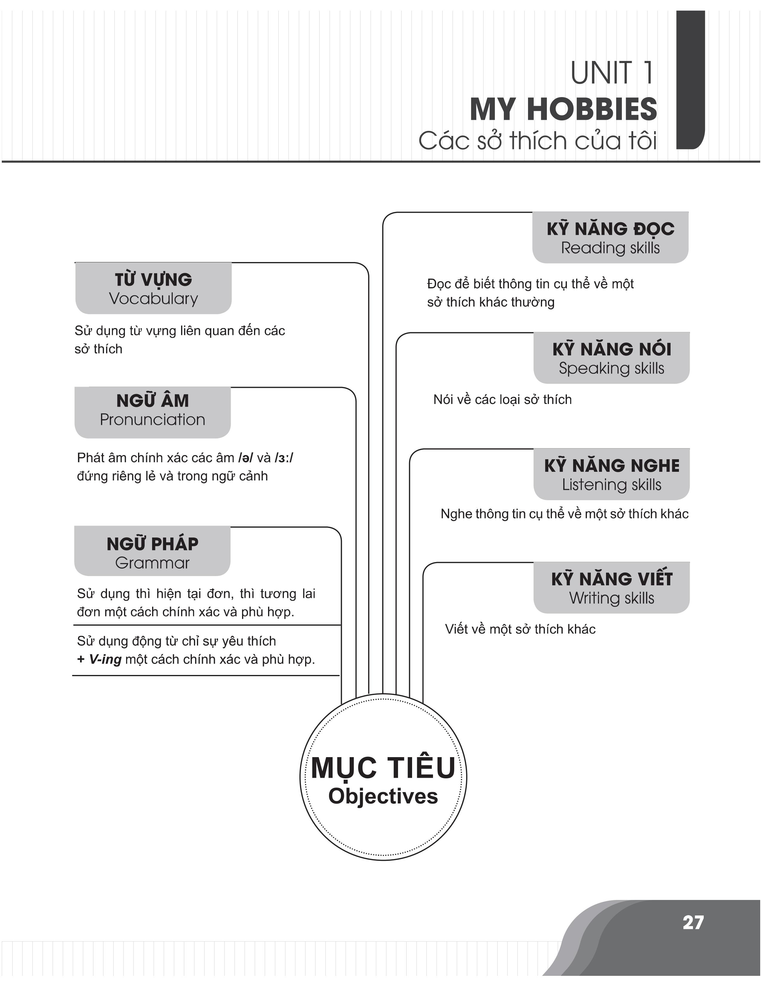 – Mục tiêu (Objectives): Khái quát những yêu cầu về từ vựng, ngữ âm, ngữ pháp và kỹ năng mà các em cần đạt được sau khi học xong mỗi Unit.
