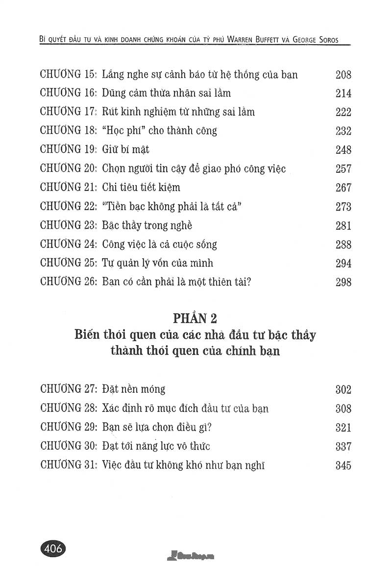Bí Quyết Đầu Tư Và Kinh Doanh Chứng Khoán Của Tỷ Phú Warren Buffett Và George Sorosviết về Warren Buffett Và George Soros đều khởi nghiệp từ hai bàn tay trắng, và họ cùng làm nên những gia tài trị giá hàng chục tỷ đô la chỉ bằng một hoạt động đầu tư. Tuy nhiên, sự nghiệp của hai người lại trái ngược và mâu thuẫn với nhau như mặt trăng mặt trời.