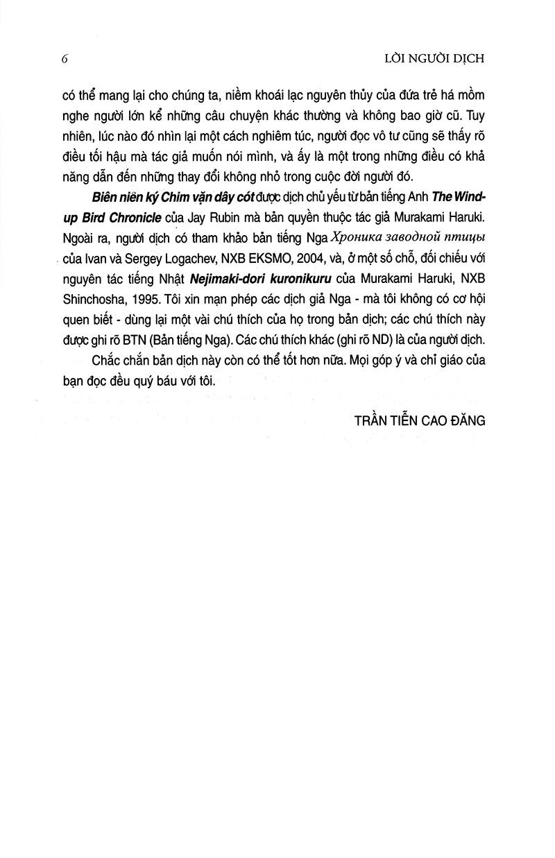 Tiếng hót của con chim vặn dây cót chỉ vang lên vào những thời khắc quyết định, khi con người tỉnh thức những tiếng lòng thầm kín, hay khoảnh khắc thấu suốt cảm giác về định mệnh; tiếng chim tiên báo những thảm họa khốc liệt khơi nguồn từ chính con người, cũng là tiếng thúc giục âm thầm của khát vọng đi tìm chân lý. Tiếng hót của chim vặn dây cót trở thành biểu tượng sự thức tỉnh những xúc cảm mãnh liệt và sự trưởng thành về bản ngã của con người trong đời sống hiện đại. Đó chính là ý nghĩa của hình tượng chim dây cót xuyên suốt cuốn tiểu thuyết lớn của Haruki Murakami.