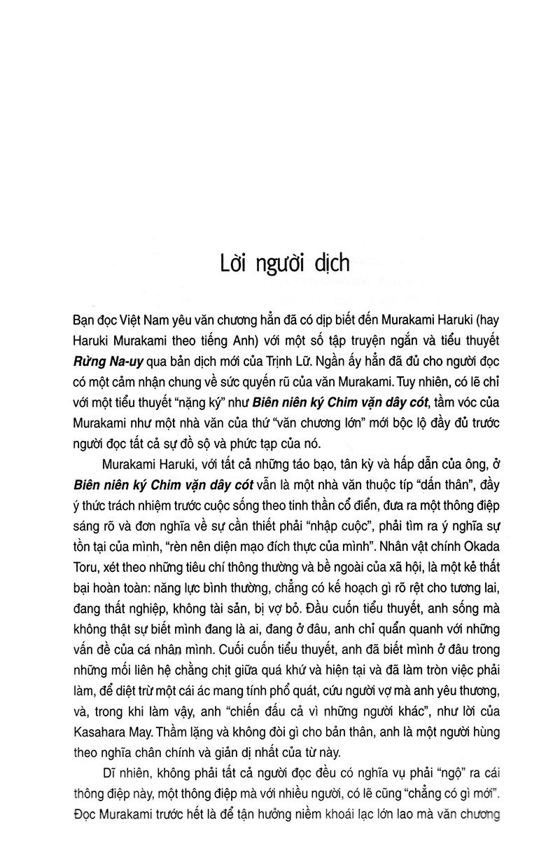Câu chuyện đưa ta đến nước Nhật thời hiện đại, với những thân phận con người bé nhỏ, lạ lùng. Những cô bé 15 tuổi, như Kasahara May, ngồi sau xe môtô phóng với tốc độ kinh hoàng, vươn tay bịt mắt bạn trai phía trước. Sau tai nạn, bạn trai qua đời, chỉ còn lại mình cô với nỗi day dứt khôn nguôi: "Chính vì có cái chết, người ta mới phải băn khoăn nhiều đến thế về sự sống." Những thiếu nữ, như Kano Kreta, tự kết liễu đời mình để giải thoát những cơn đau triền miên có thể gặp phải bất cứ lúc nào, vì bất cứ điều gì nhưng không thành. Phải trả nợ một khoản tiền lớn cho hãng bảo hiểm, không do dự, cô đi làm gái điếm. Những Dân biểu nghị viên như Wataya Noburu, leo cao trong danh vọng nhờ tài lừa dối đám đông và khả năng khơi dậy những bản năng sa đọa ở người khá Trong thế giới ấy, nhân vật chính của Biên Niên Ký Chim Vặn Dây Cót, Okada Toru, chàng trai giản dị và chân thành, phải đối mặt với biến cố lạ lùng: Kumiko, người vợ yêu dấu của anh bỗng nhiên biến mất không một lời nhắn gửi. Sự kiện phi lý này khơi nguồn cho sự thức tỉnh trong Okada, thúc đẩy anh ngắm nhìn, chứng nghiệm lại thế giới tràn đầy cái phi lý chung quanh mình, bằng con mắt bản thể.