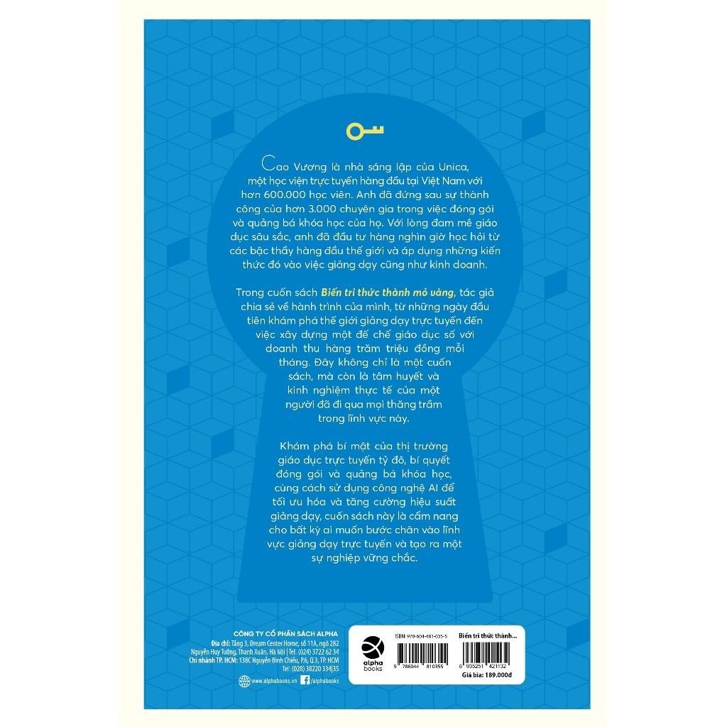 Sách: Biến Tri Thức Thành Mỏ Vàng - Bí Quyết Xây Dựng Khóa Học Online Và Trở Thành Chuyên Gia Đào Tạo (Alpha Books) THÔNG TIN MÔ TẢ Tác giả: Cao Vương Nhà phát hành: Alpha Books Nhà xuất bản: NXB Công Thương Số trang: 240 Bìa mềm tay gấp Khổ sách: 16x24cm Năm xuất bản: 2024 MÔ TẢ SẢN PHẨM TÓM TẮT SÁCH Cuốn sách này được chia thành năm phần chính, bao gồm: Chạm tay vào thị trường tỷ đô, Lộ trình xây dựng khóa học trực tuyến từ A - Z, Bí quyết thu hút học viên đến khóa học, Bí mật của webinar và bootcamp, Suy nghĩ như một nhà đào tạo triệu phú. Mỗi phần đều bao gồm các chương chi tiết, với các bước cụ thể, chiến lược và bài tập để giúp bạn áp dụng những gì đã học vào thực tế.