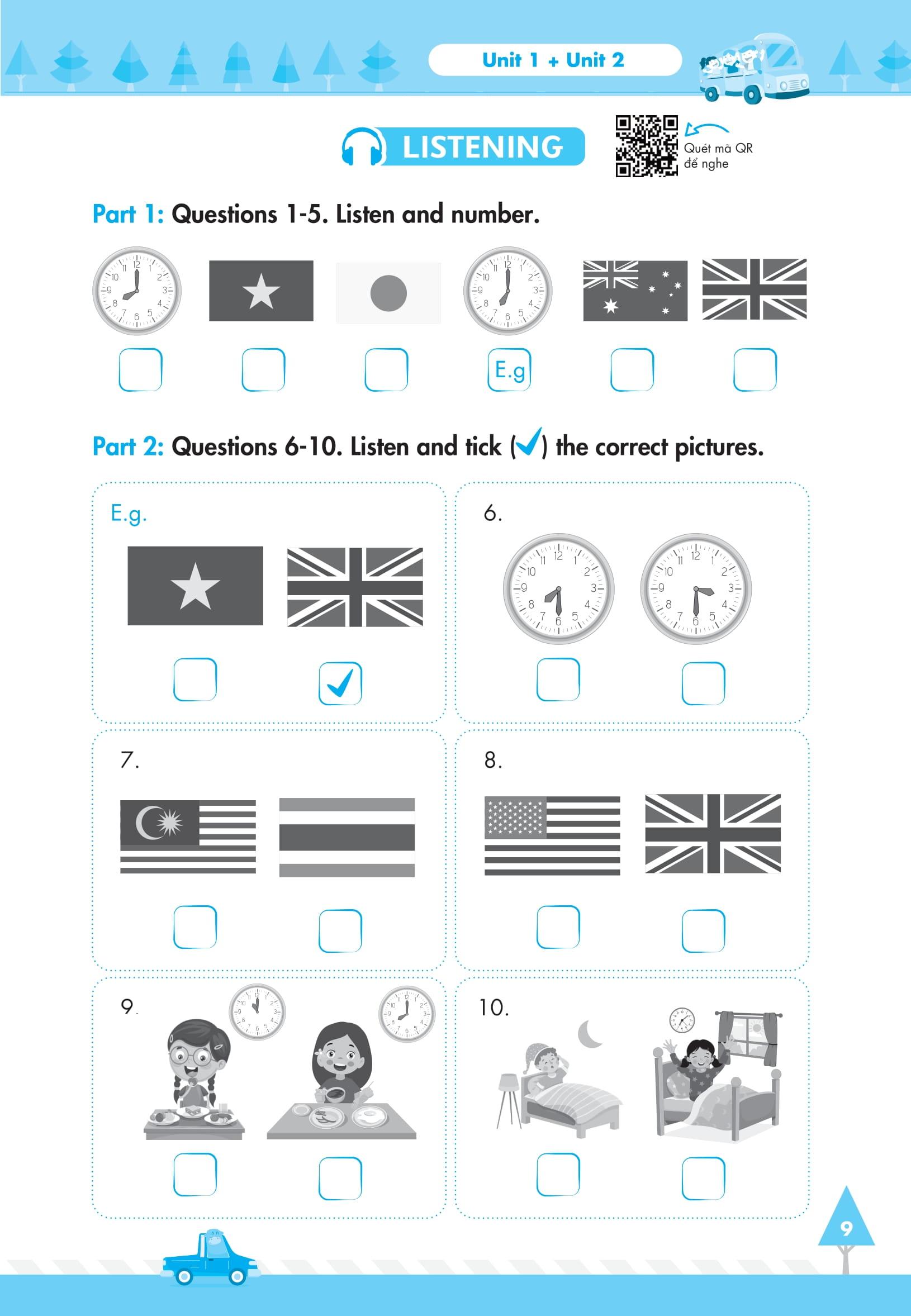 Cứ hai bài sẽ có 2 bài kiểm tra, tất cả các bài kiểm tra đều được thiết kế theo quy định thông tư mới nhất về kiểm tra môn Tiếng Anh tiểu học.
