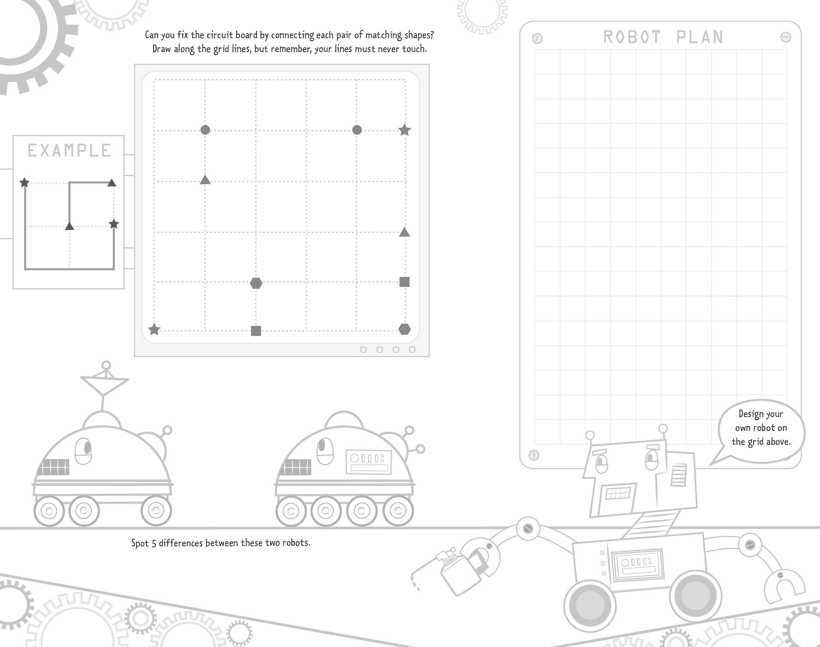 Each puzzle-packed page in this book has a different theme, from robots and space to Ancient Egypt and the Wild West, and the back of each sheet features another puzzle, with outline illustrations to complete and colour in.
