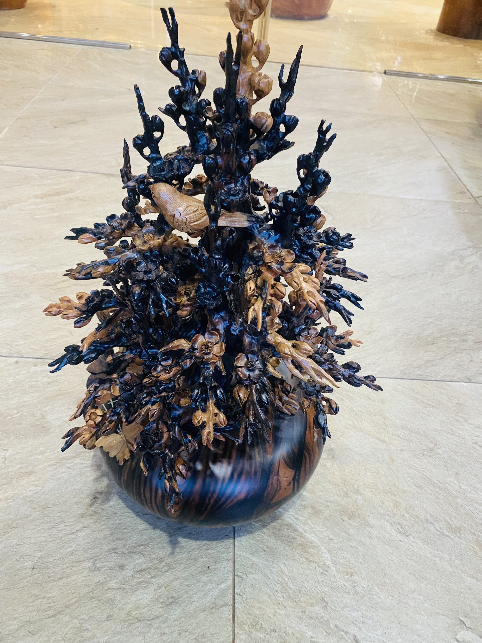 _ Bình hoa mai phú quý trang trí phong thủy được làm bằng chất liệu gỗ mun hoa tự nhiên 100%