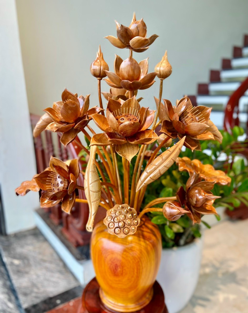 _ Bình hoa sen trang trí phòng thờ phòng khách ,phòng khách được làm bằng chất liệu gỗ mun đuôi công tự nhiên 100% _ kt bình cắm hoa 23×37cm + kt 25 hoa lá