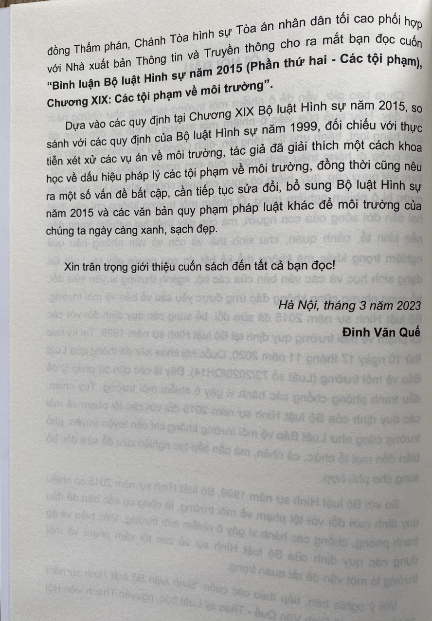 Bình Luận Bộ Luật Hình Sự Năm 2015 - Phần Các Tội Phạm Chương XIX Các Tội Phạm Về Môi Trường - Tác giả: Đinh Văn Quế - Nhà xuất bản: Thông tin và Truyền Thông -